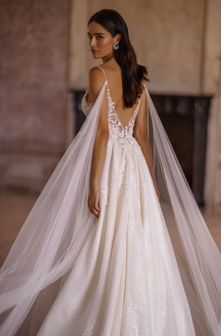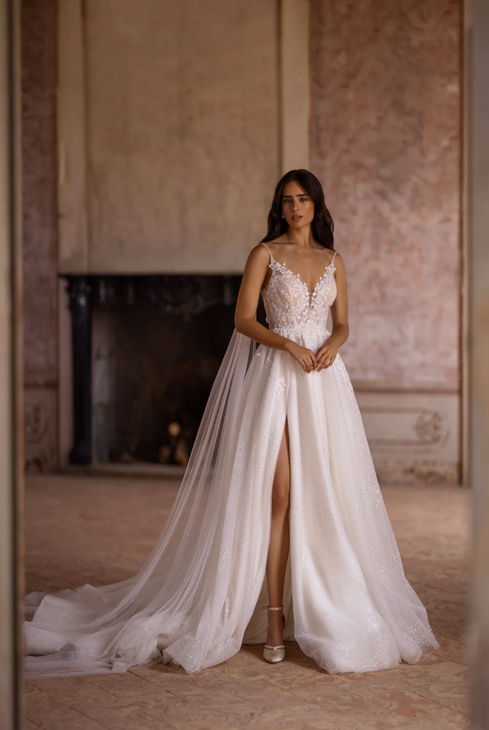 Pair the Mariella Gown with a delicate crystal necklace, soft romantic waves, and a fingertip-length veil to create a look that radiates effortless charm and sophistication. Ideal for picturesque garden ceremonies, grand chateau celebrations, or intimate twilight vows.