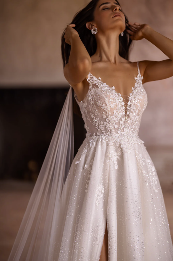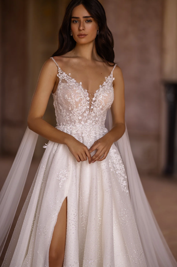 The Mariella Gown is an exquisite celebration of classic beauty and refined luxury, designed for the bride who cherishes romance and elegance. A breathtaking sweetheart neckline highlights your natural beauty, elegantly embellished with intricate floral embroidery that gracefully adorns the semi-sheer corseted bodice. Detachable, off-the-shoulder sleeves drape softly, adding a touch of ethereal romance. The voluminous skirt gently cascades from the defined waistline into an enchanting train, richly adorned with subtle, shimmering details that dance gracefully as you move.
