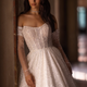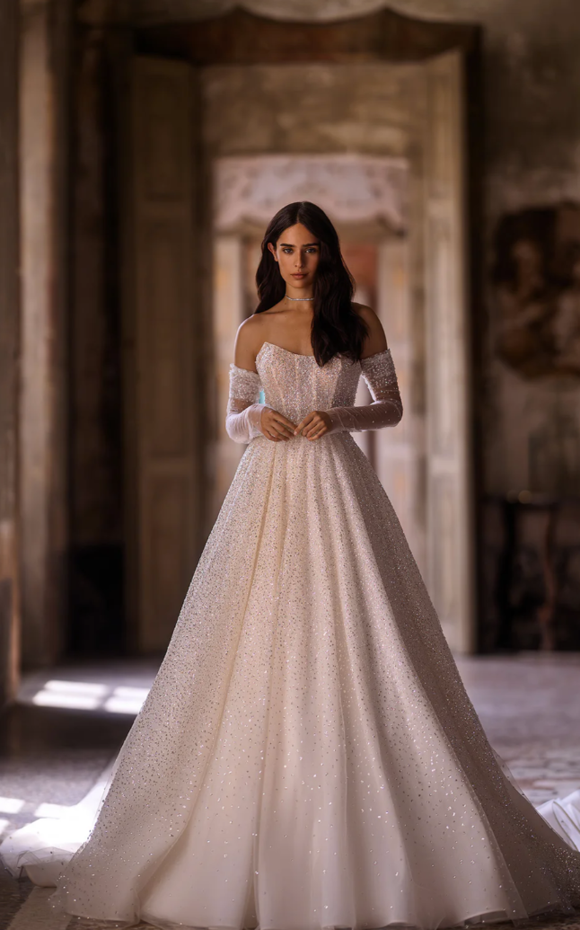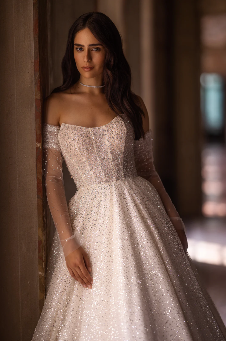 Graceful, romantic, and ethereal, the Maribella Gown embodies the enchantment of true love's promise. The off-the-shoulder neckline features delicate, sheer sleeves adorned with clusters of whimsical three-dimensional floral appliqués, cascading softly into the shimmering corset bodice. Intricately scattered blooms and luminous beaded details sparkle throughout, evoking the soft glow of starlight. The lavish skirt flows seamlessly from the natural waist, culminating in a breathtaking cathedral-length train that exudes regal elegance with each step you take toward forever. This gown beautifully blends timeless sophistication with modern allure, creating a look of unforgettable bridal radiance.