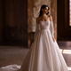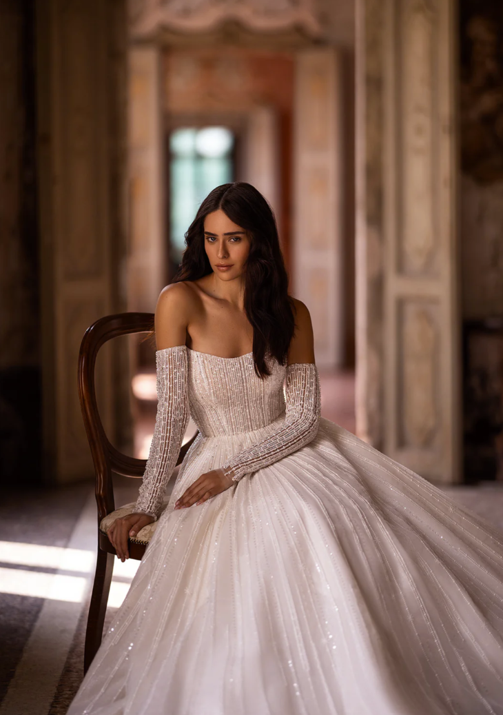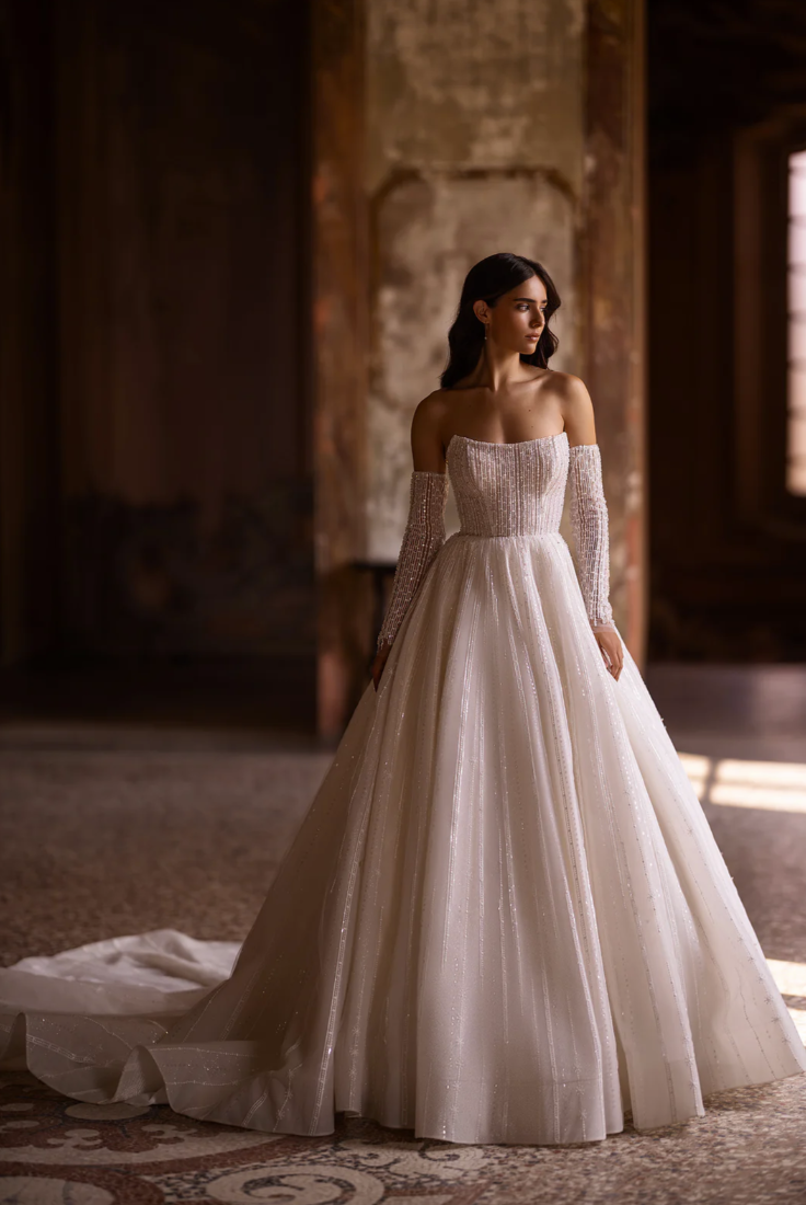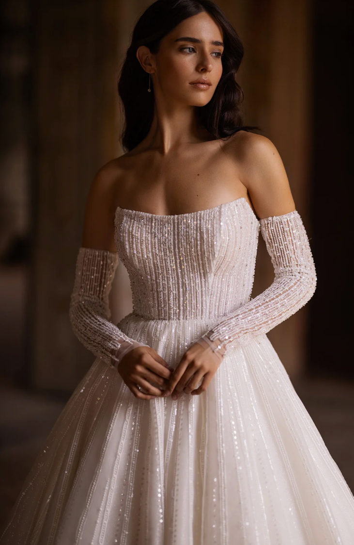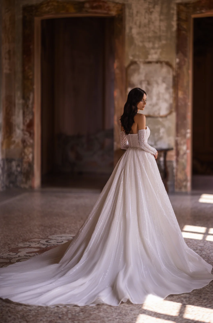 The opulent skirt cascades gracefully into a full A-line shape, crafted from layers of luminous, shimmering fabric, creating a magical sparkle with each movement. A dramatic train effortlessly trails behind, adding grandeur to your walk down the aisle and ensuring an unforgettable entrance.