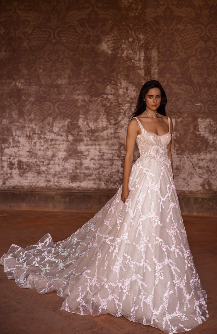 Discover the epitome of fairytale elegance with the exquisite Saphina Gown, an enchanting masterpiece designed for the bride who dreams of an ethereal entrance. Crafted from luxurious layers of delicate tulle and ornate lace, this gown captivates with its dazzling embroidered details, reminiscent of a lush, blossoming garden illuminated by moonlight. The intricately structured bodice gracefully accentuates the feminine form, enhanced by a romantic sweetheart neckline and elegant shoulder straps for a touch of timeless sophistication. Flowing effortlessly into a majestic skirt, the gown reveals subtle sparkle patterns that shimmer softly with every movement, culminating in a dramatic, sweeping train fit for a queen.