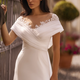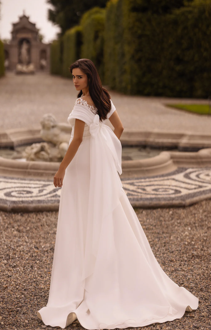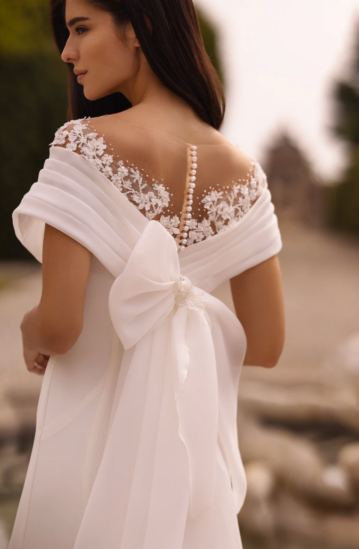 Discover the sophisticated charm of the Serafina Gown, an enchanting blend of contemporary elegance and timeless romance. This captivating gown features an off-the-shoulder neckline artfully accented with delicate embroidered lace, framing the shoulders beautifully and continuing into an alluring sheer illusion back adorned with a delicate row of luminous pearls. Graceful pleated fabric sweeps across the bodice, accentuating your figure before culminating in a statement-making bow at the back, adding a touch of whimsical charm. A sleek, tailored silhouette subtly flares into a flowing skirt, highlighted by an alluring high slit that gracefully showcases just the right amount of leg.