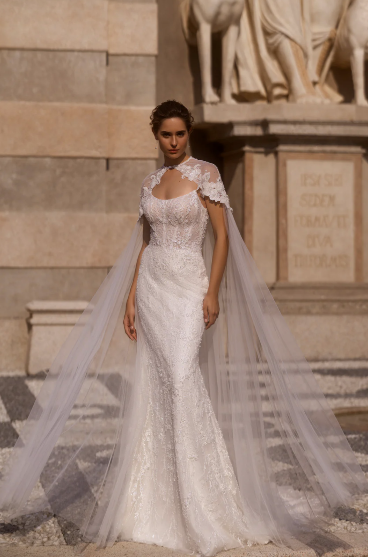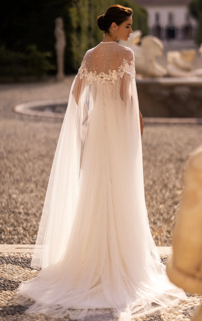 But what truly sets Seraphielle apart is its detachable lace cape overlay, adorned with dainty floral appliqués and whisper-light tulle that flows behind like wings. The effect is breathtaking—perfect for brides who dream of making a grand, regal entrance.