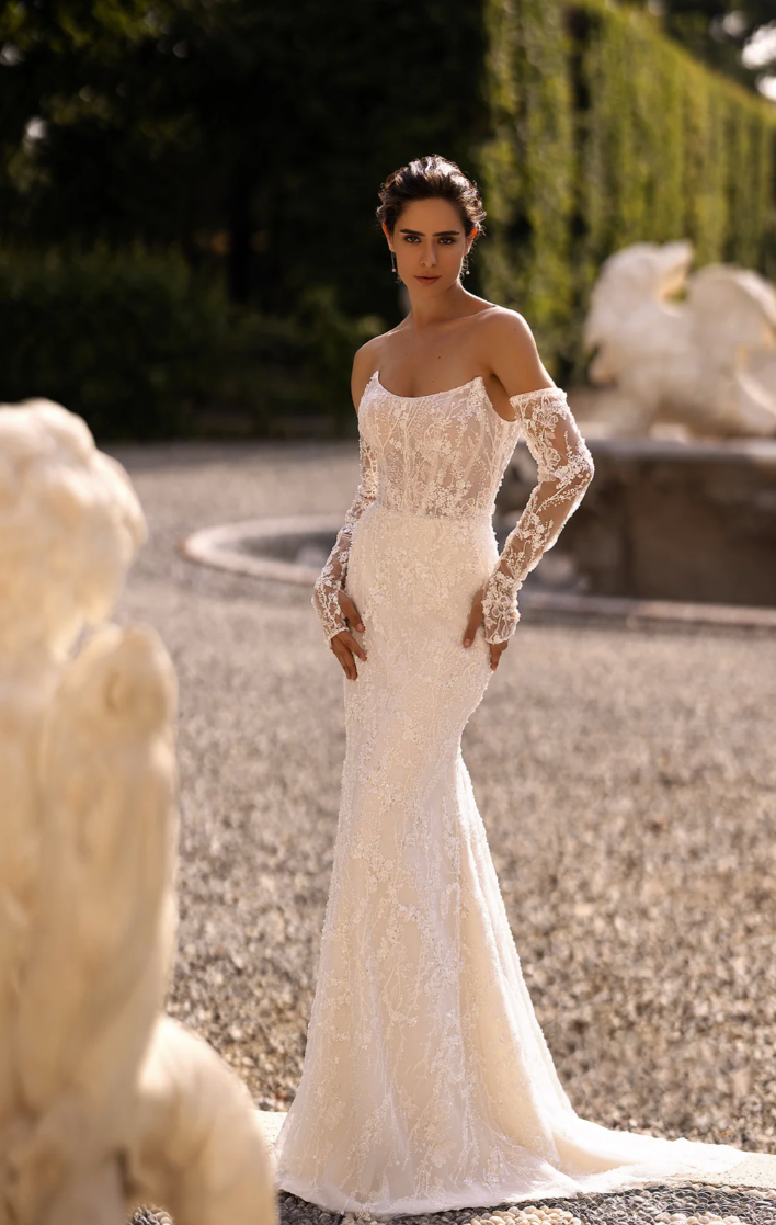 A captivating masterpiece that evokes timeless grace, the Seraphielle Gown is where ethereal beauty meets contemporary couture. Crafted in delicate lace embroidery and shimmering sequin embellishments, this gown features a flattering structured bodice with romantic off-the-shoulder sheer lace sleeves. The silhouette gently hugs the figure before cascading into an elegant sweep train, offering a look of graceful sophistication.