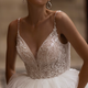 Command the aisle in the breathtaking Valentina Grandeur Gown, a masterpiece designed for the bride who dreams in layers of luxury. This voluminous ball gown stuns with cascading tiers of soft ivory tulle that create a cloud-like silhouette, evoking timeless romance and modern royalty. The structured bodice features a deep illusion V neckline adorned with intricate sequin and bead embroidery that glimmers with every movement, offering a radiant contrast against the ethereal skirt.