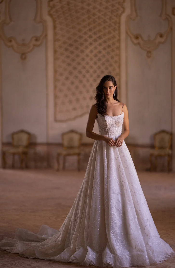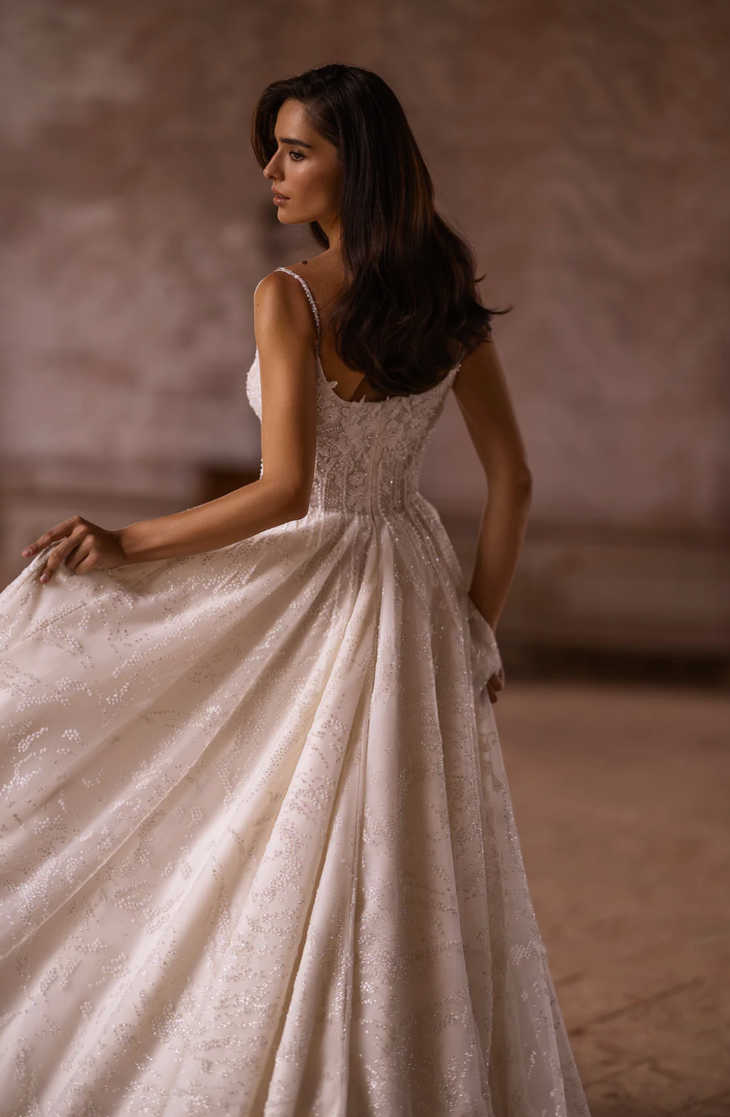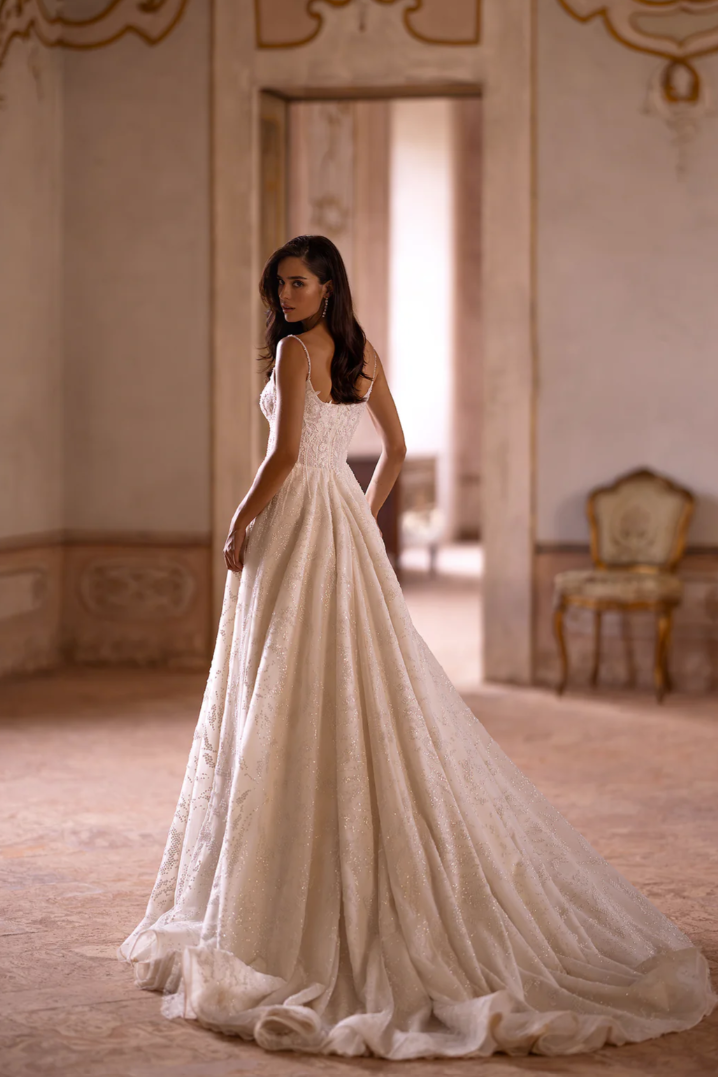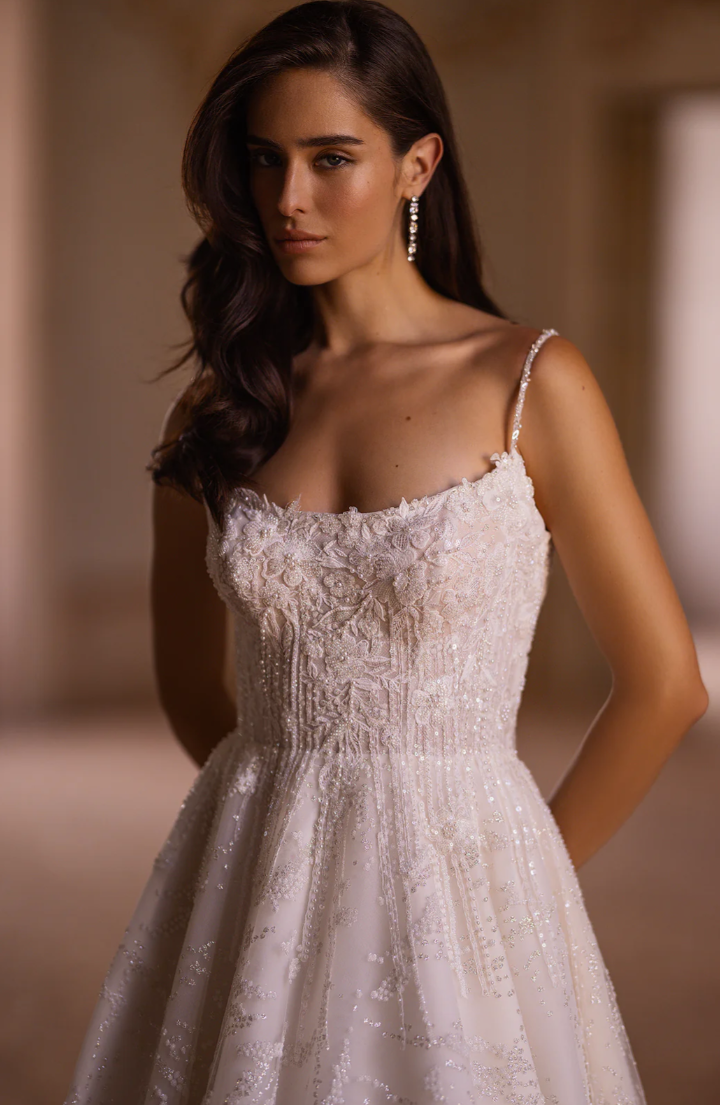 Delicate beaded straps lead to a softly contoured neckline, highlighting the décolletage with a hint of subtle allure. The gown’s luxurious layers of textured tulle and luminous sequin detailing catch the light with every movement, creating a dreamy, radiant glow from ceremony to celebration. The skirt gently cascades into a romantic train, offering a regal finish that’s unforgettable from every angle.