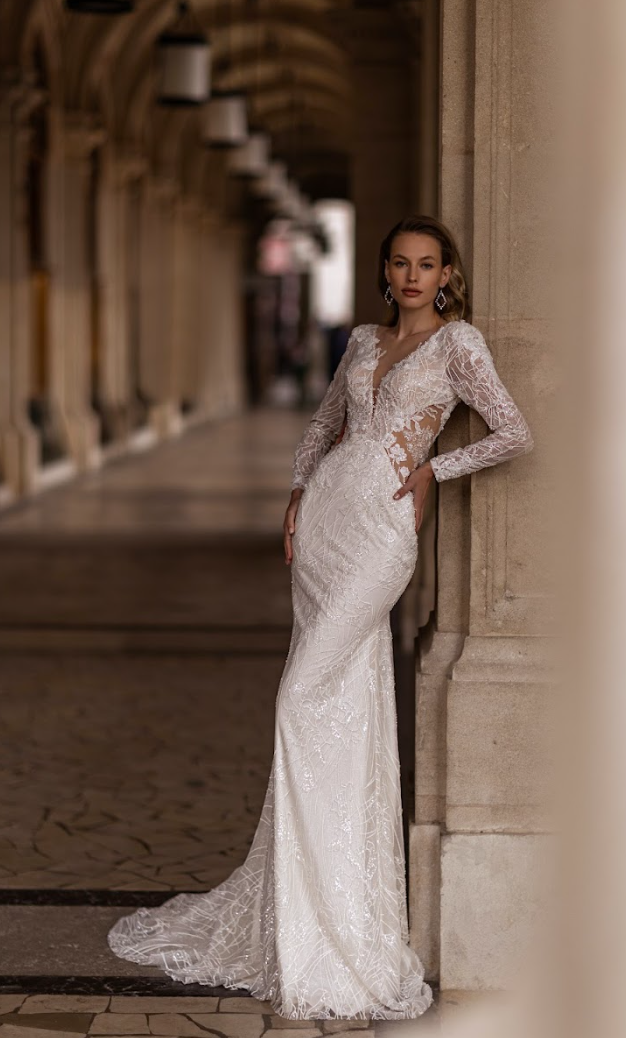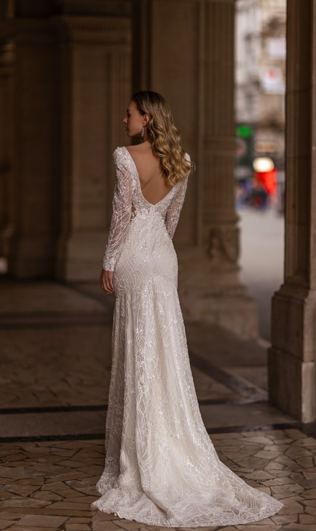Pair this gown with statement crystal drop earrings, a sleek low chignon, and a cathedral-length veil for a look that radiates modern royalty. Perfect for grand castle weddings, moonlit garden ceremonies, or an opulent ballroom affair. Transition to your reception by removing the overskirt and letting your silhouette dazzle beneath the stars.