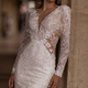 The form-fitting base features a shimmering layer of hand-embroidered floral beadwork that cascades across the bodice and down the hips, capturing the light with every graceful movement. The strapless sweetheart neckline is framed by delicate off-the-shoulder puff sleeves and sheer illusion long sleeves, adorned with intricate lace and bead appliqués.