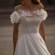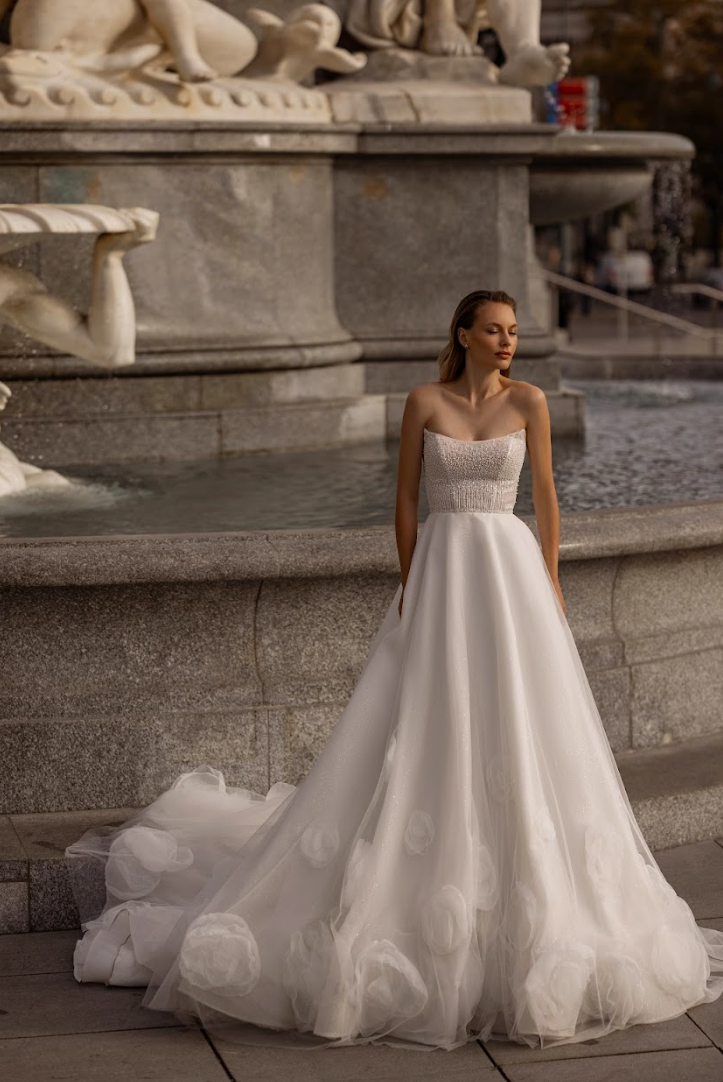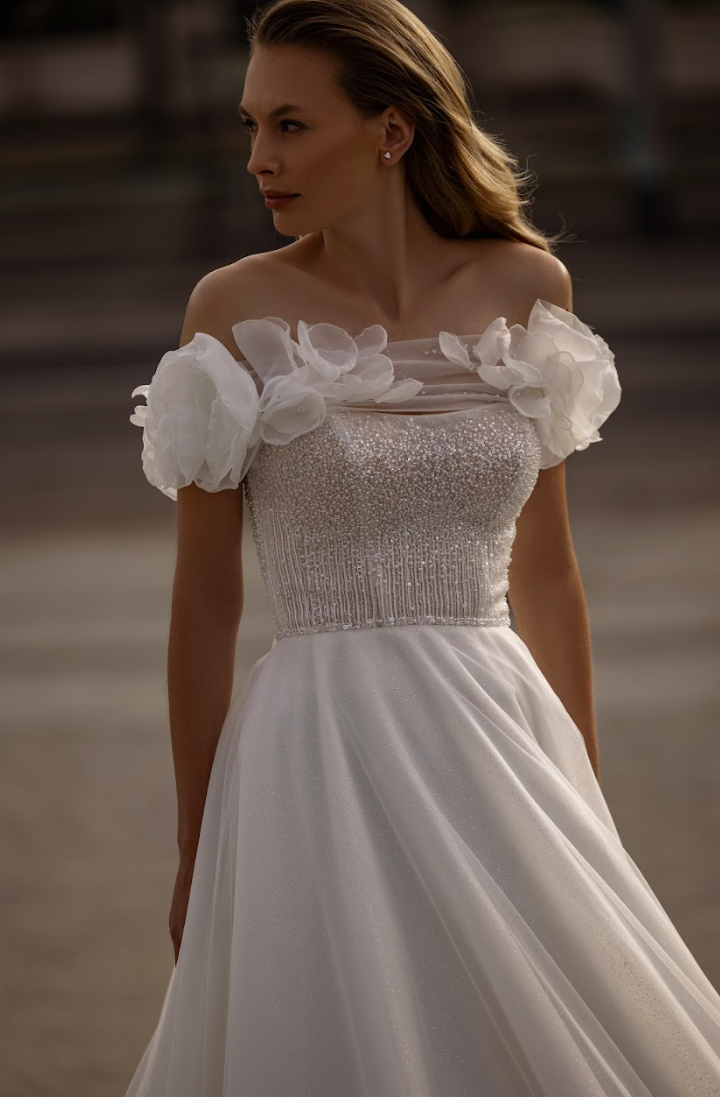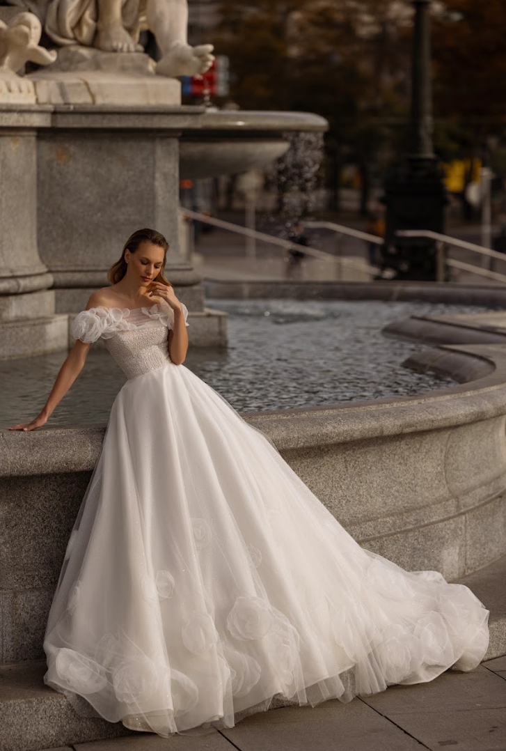 The voluminous skirt, layered in soft glistening tulle, cascades into a dreamy chapel-length train that trails behind like a whisper of elegance. The gown offers two breathtaking styling options—an effortless sweetheart neckline for a minimalist, refined look or an optional floral tulle off-the-shoulder wrap with three-dimensional blossoms that frame the décolletage in romantic splendor.