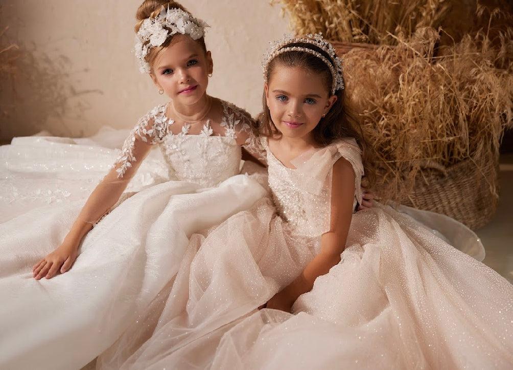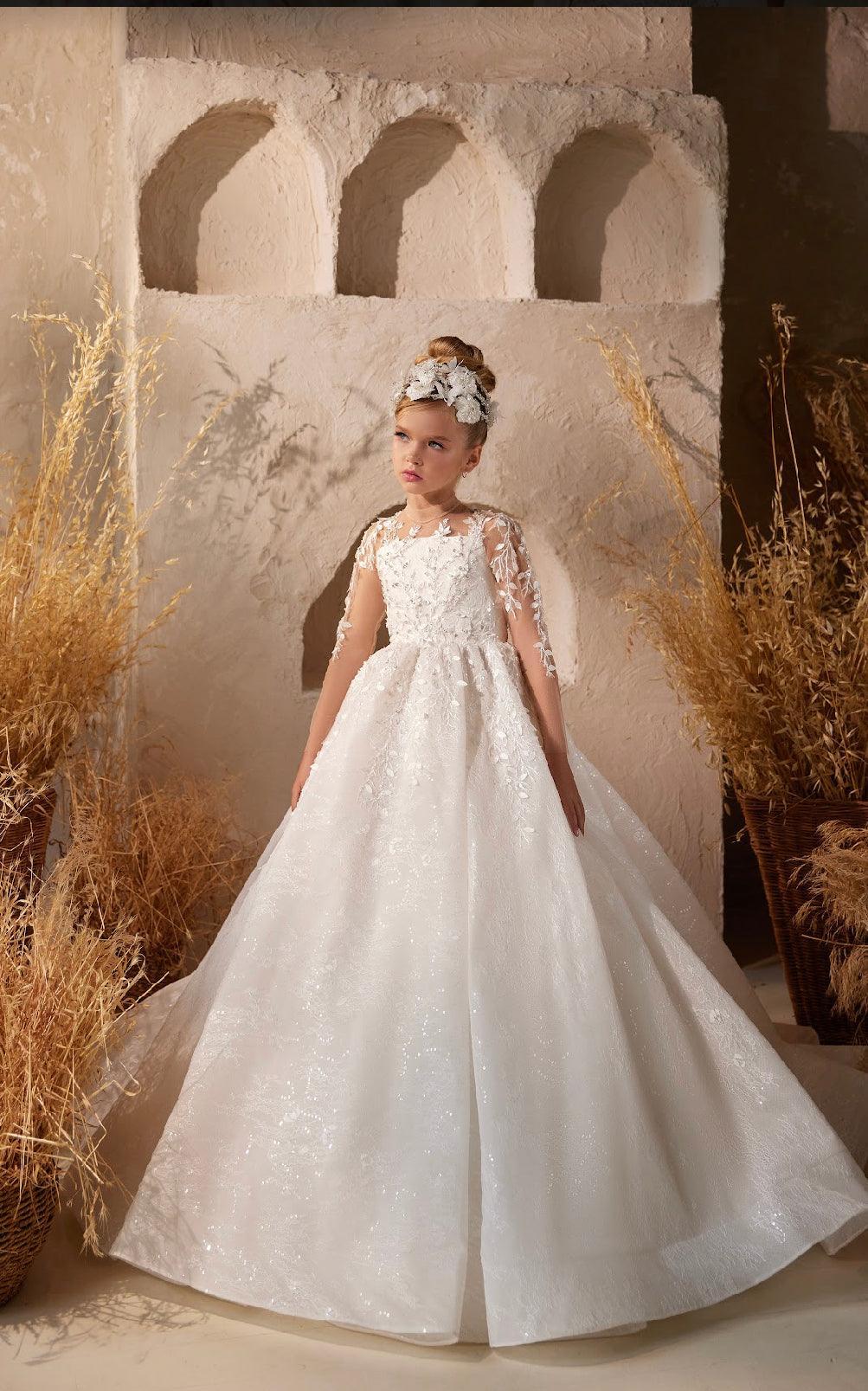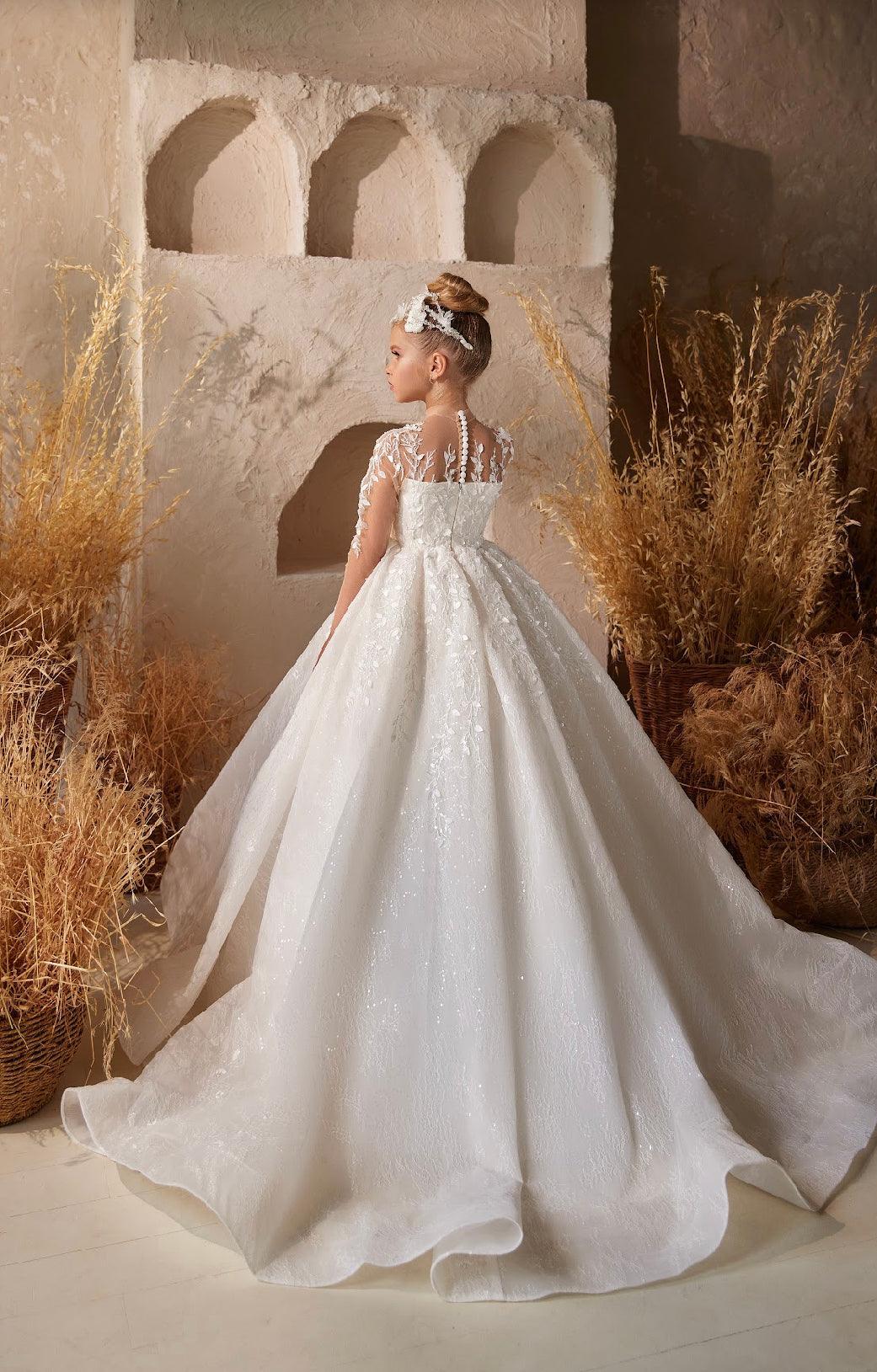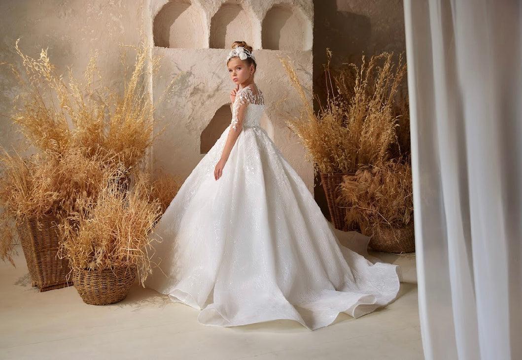 The dress gently cinches at the waist, emphasizing its classic A-line silhouette. The skirt flows gracefully and extends into a train at the back, making the child feel like royalty.