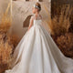 The subtly rounded neckline allows the detailed bodice to take center stage. The same leaf motifs cascade onto the skirt and merge seamlessly into its voluminous layers.