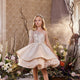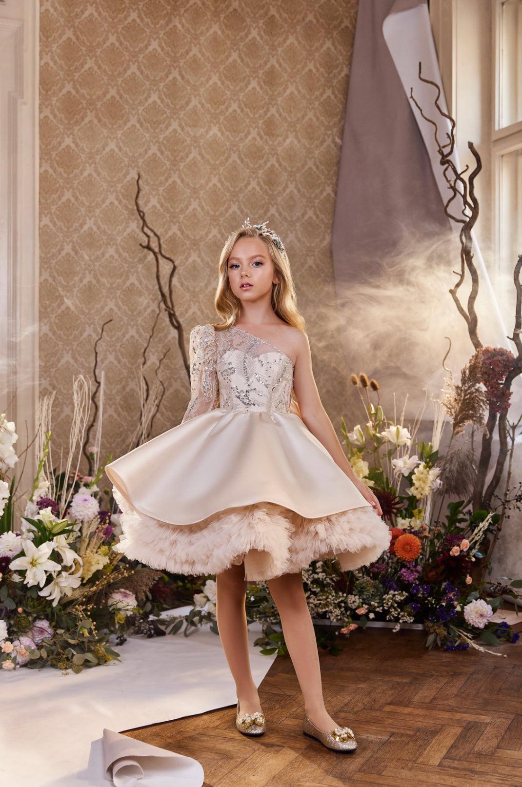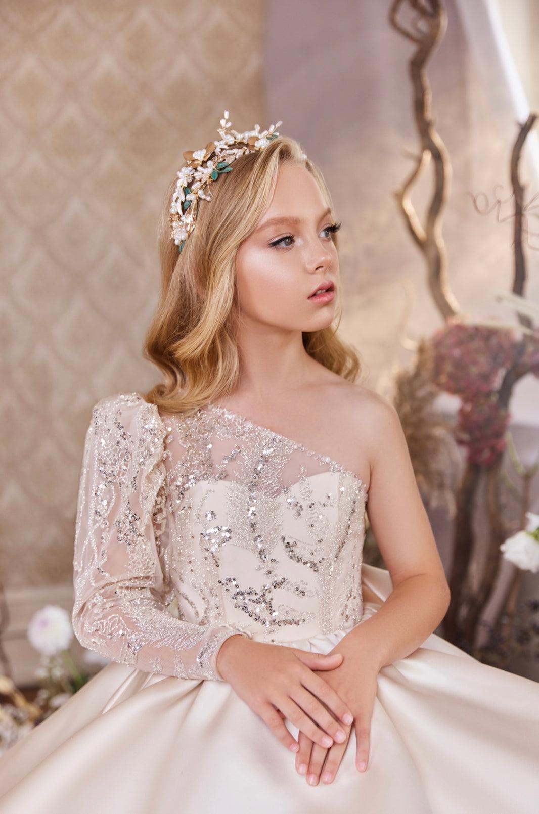 This enchanting one-shoulder gown features a structured satin bodice adorned with delicate floral appliqués and shimmering embellishments that exude elegance. The asymmetrical sleeve is crafted from a sheer, embellished fabric, adding a unique touch to the silhouette. A voluminous satin skirt with layers of soft, feathered ruffles underneath creates a dramatic flair, making it the perfect choice for any little princess.