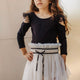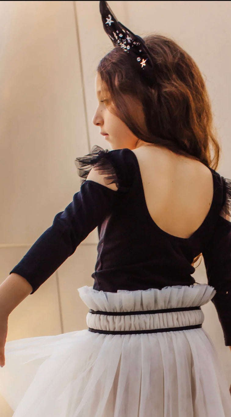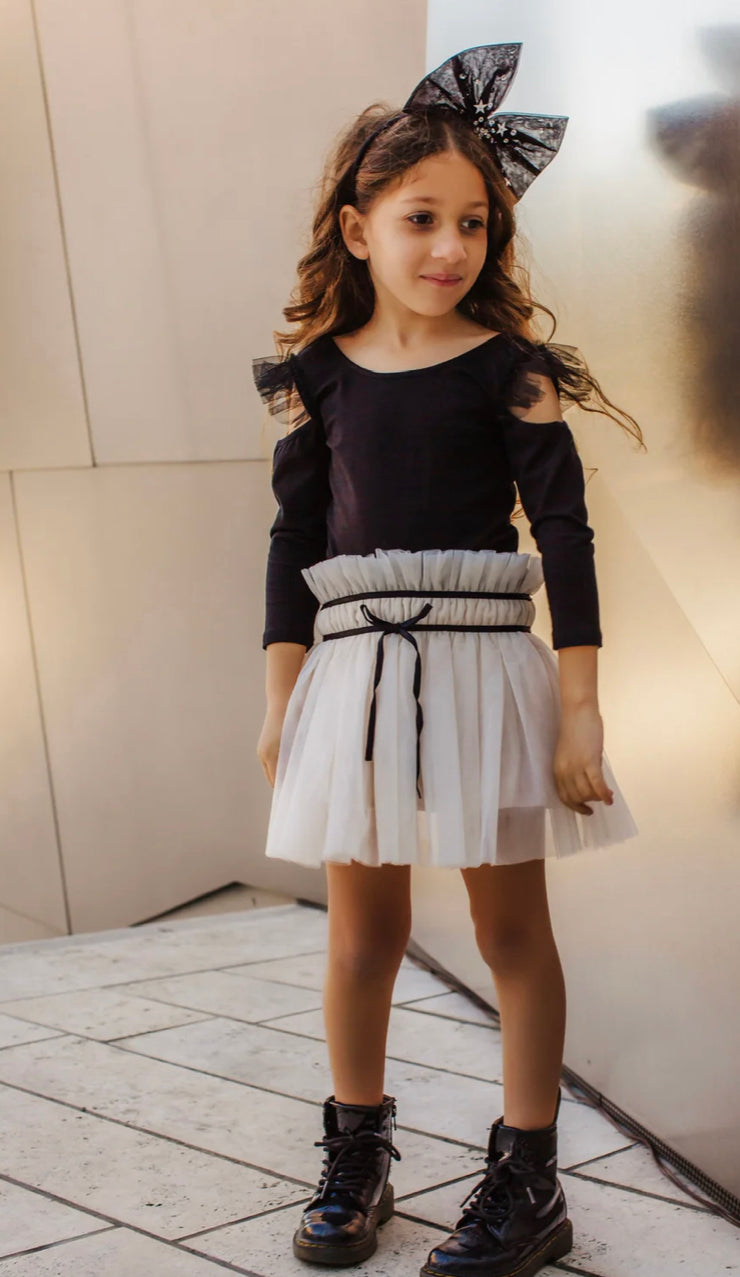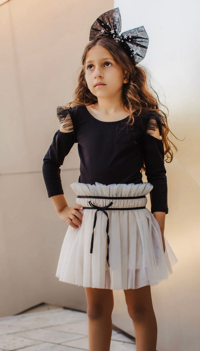 Skirt: The accompanying CoCo tulle skirt adds a whimsical and playful touch, with a cinched, ruffled waistband and contrasting black bow tie detail for a sophisticated look. The layered tulle offers volume and movement, making it perfect for twirling!