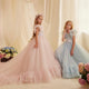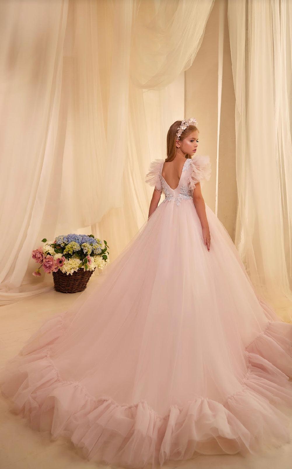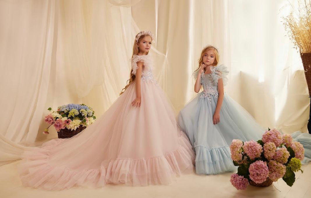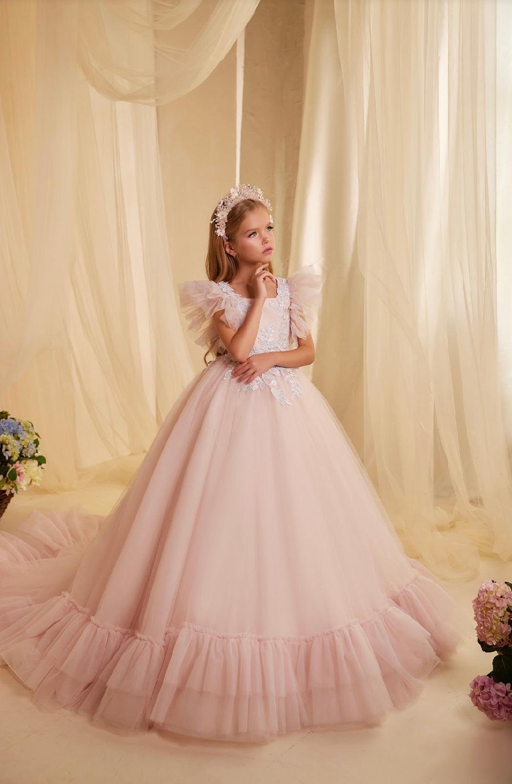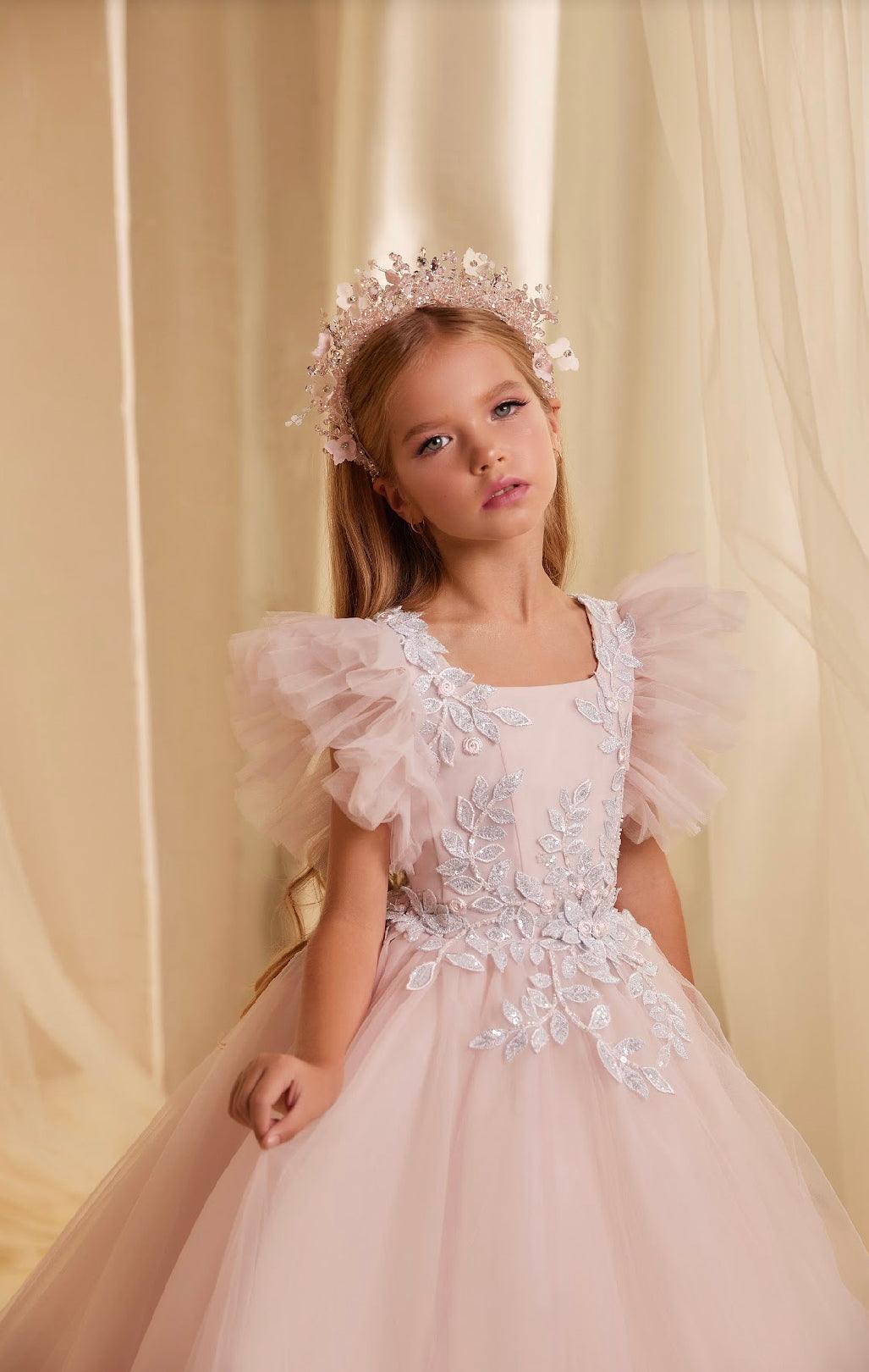 This enchanting "Calliope" dress is a dream come true for any young girl. Available in soft blush pink or light blue, it sets a delicate and dreamy tone.