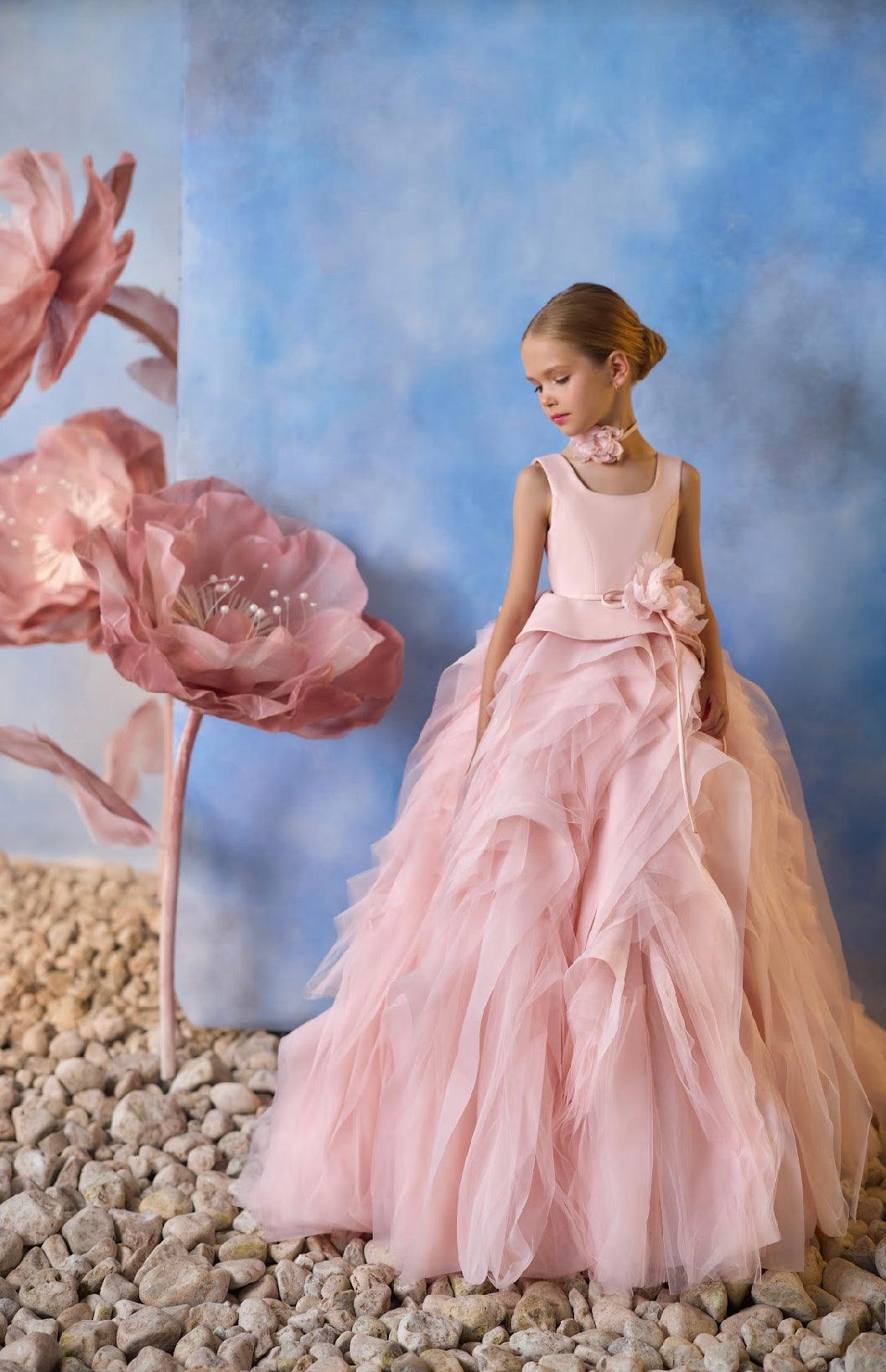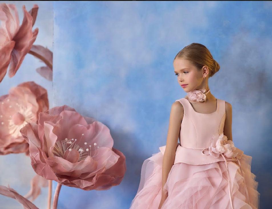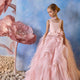 The gown features a classic ball gown silhouette with a voluminous skirt adorned with delicate floral appliqués, adding a touch of whimsy and charm. The soft pastel tones of pink and lavender create a dreamy, fairytale-inspired look, perfect for flower girls, pageants, or any formal event.