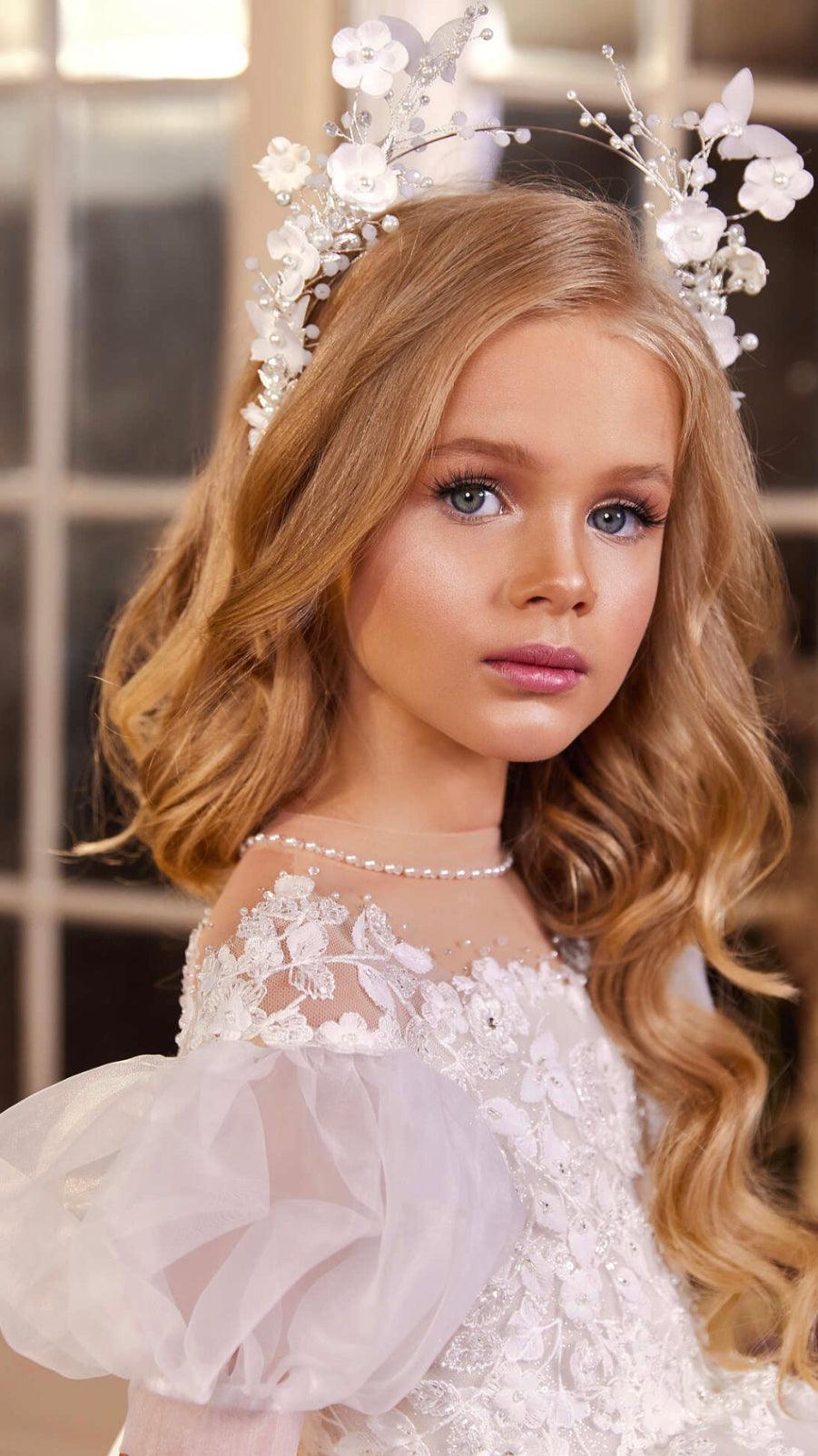 Perfect for weddings, communions, or any special occasion where she wants to feel like royalty, this tiara is designed to sit comfortably and securely on her head, ensuring she can wear it all day with ease. The intricate details and ethereal design make this tiara the perfect finishing touch for a truly unforgettable ensemble.