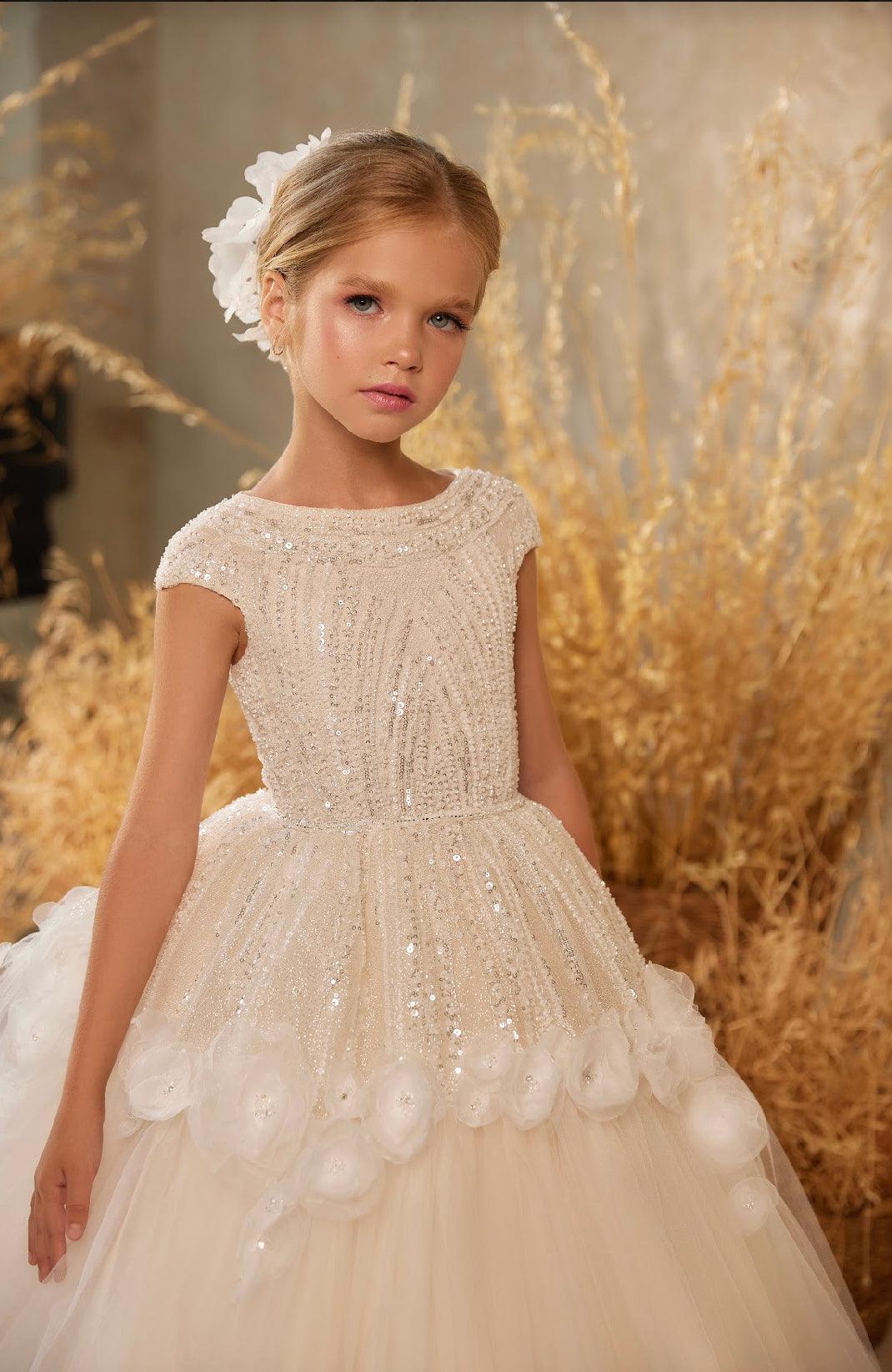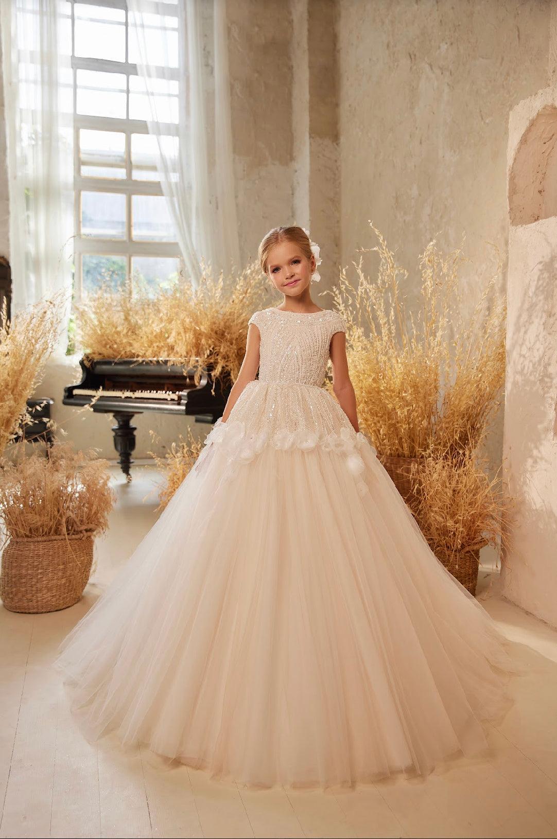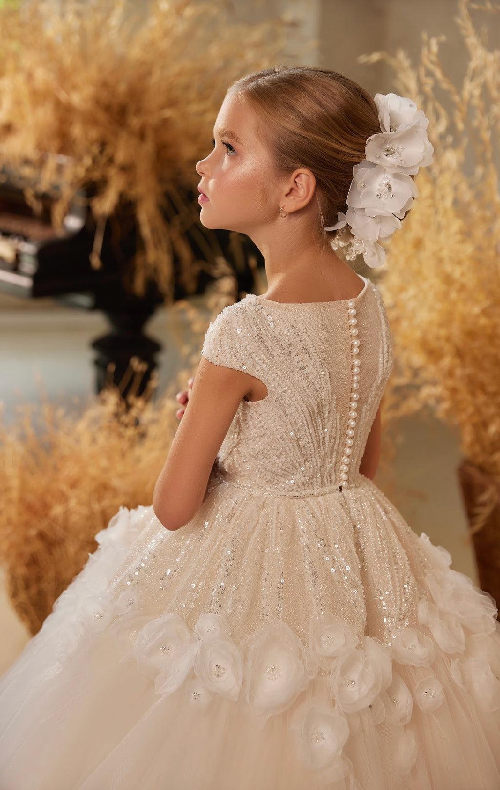 The Gale dress is a stunning beaded flower girl gown that looks beautiful from every angle. Well-suited for grand events like formal parties, milestone celebrations, or musical performances. Wearing this dress, any child would undoubtedly feel like the belle of the ball.