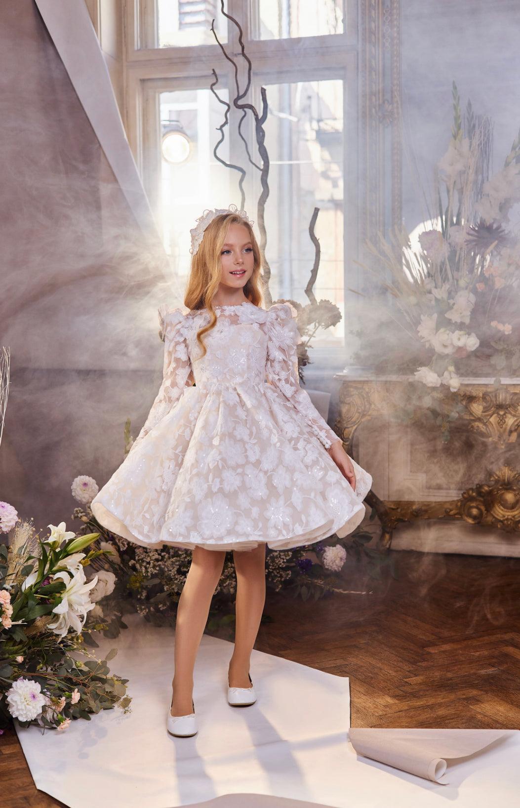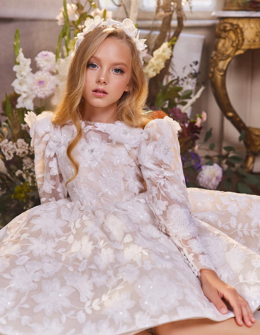 The Ivory Floral Lace Gown is an exquisite piece that captures elegance with its detailed lace bodice and puff sleeves. This gown’s design features delicate floral embroidery that cascades down the skirt, creating a luxurious, textured look. Perfect for weddings, special occasions, or formal events, the gown's long train adds a dramatic flair, making every twirl magical. The combination of classic ivory lace with contemporary detailing ensures your little one will feel like royalty in this stunning creation.