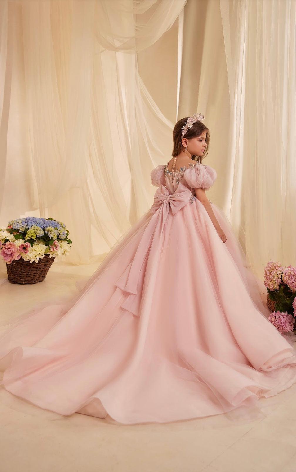 The Ginebra Flower Girl Dress for Wedding is a breathtaking piece designed specifically for memorable occasions. This A-line silhouette dress, rendered in a gentle blush pink hue, is perfect for weddings.