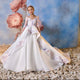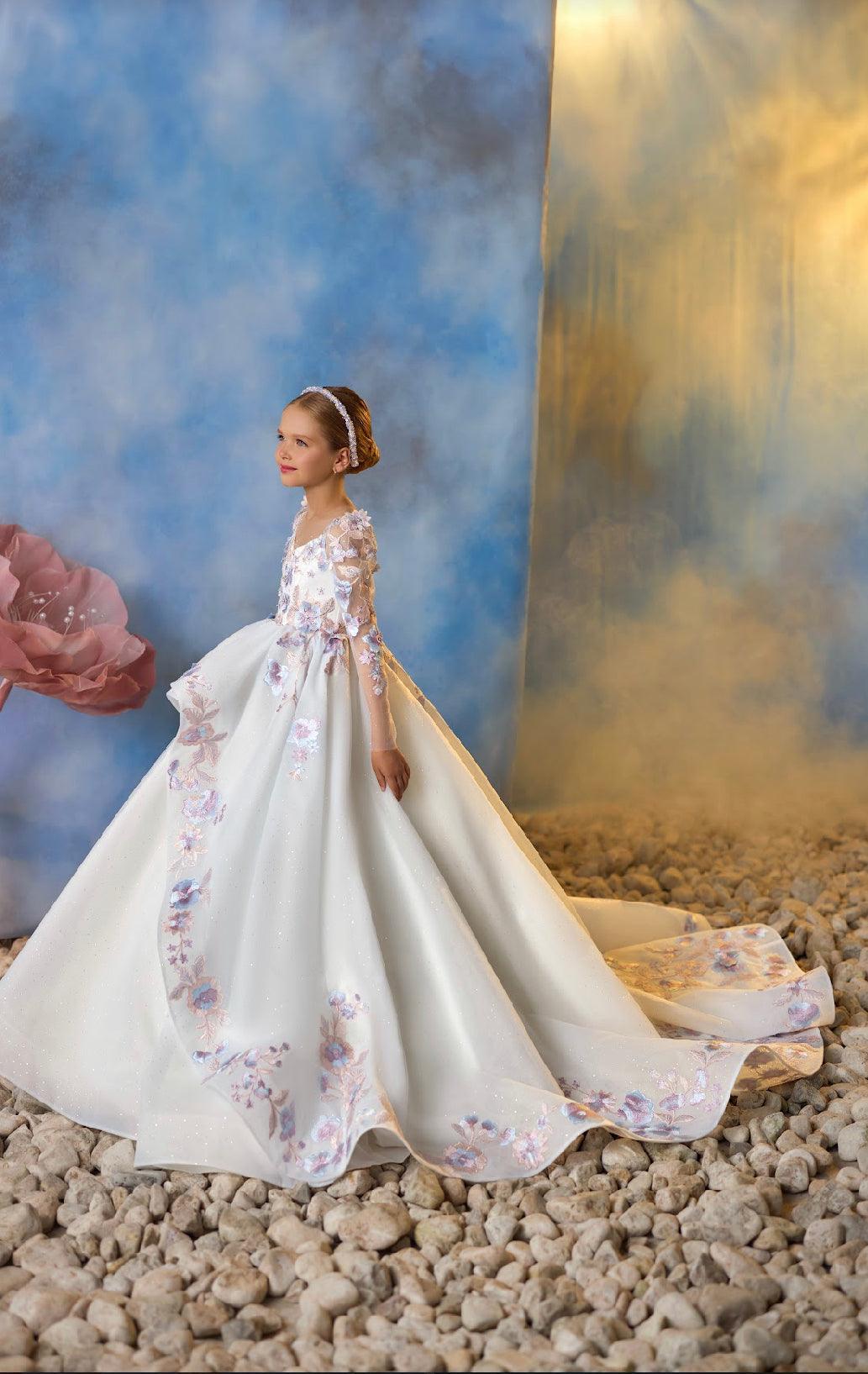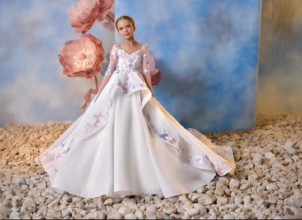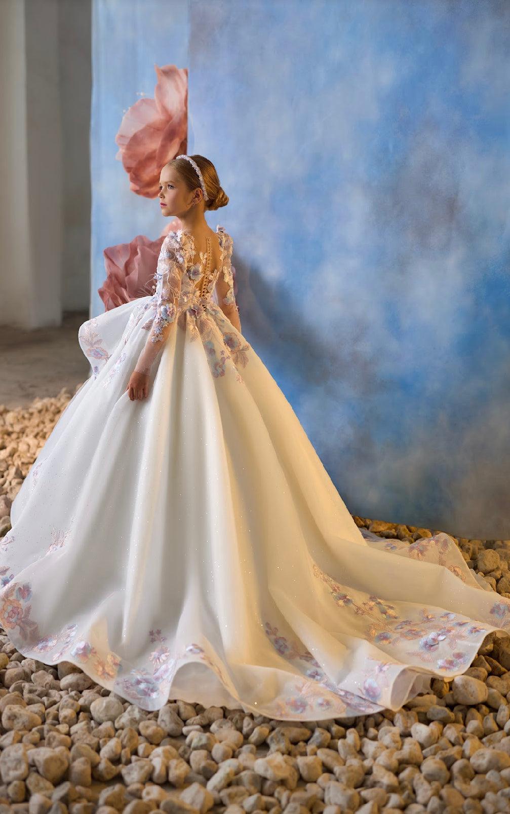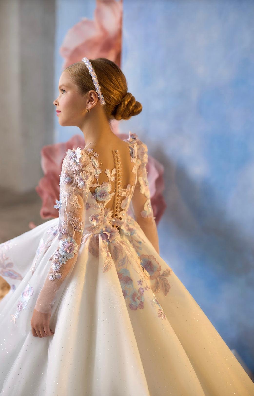 - Color & Embellishments: The gown comes in a soft ivory base, accented with pastel floral appliqués in shades of blush, lavender, and soft blue. These floral embellishments cascade down the bodice and skirt, adding a touch of whimsy and elegance. The back of the gown features a row of delicate buttons, adding a vintage-inspired charm.
