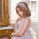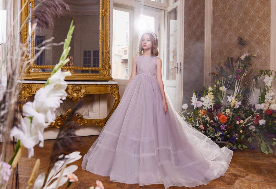 Very delicate dress in very interesting colors: violet, mint and fashionable gray-violet. The closed corset is very interestingly draped and hand-embroidered with transparent beads on the collar and waist of the outfit. The long tulle skirt has decorative lines that add mystery to the dress. Wide regline at the hem gives the dress a special splendor. A small train completes the luxurious look of the Princess.