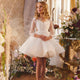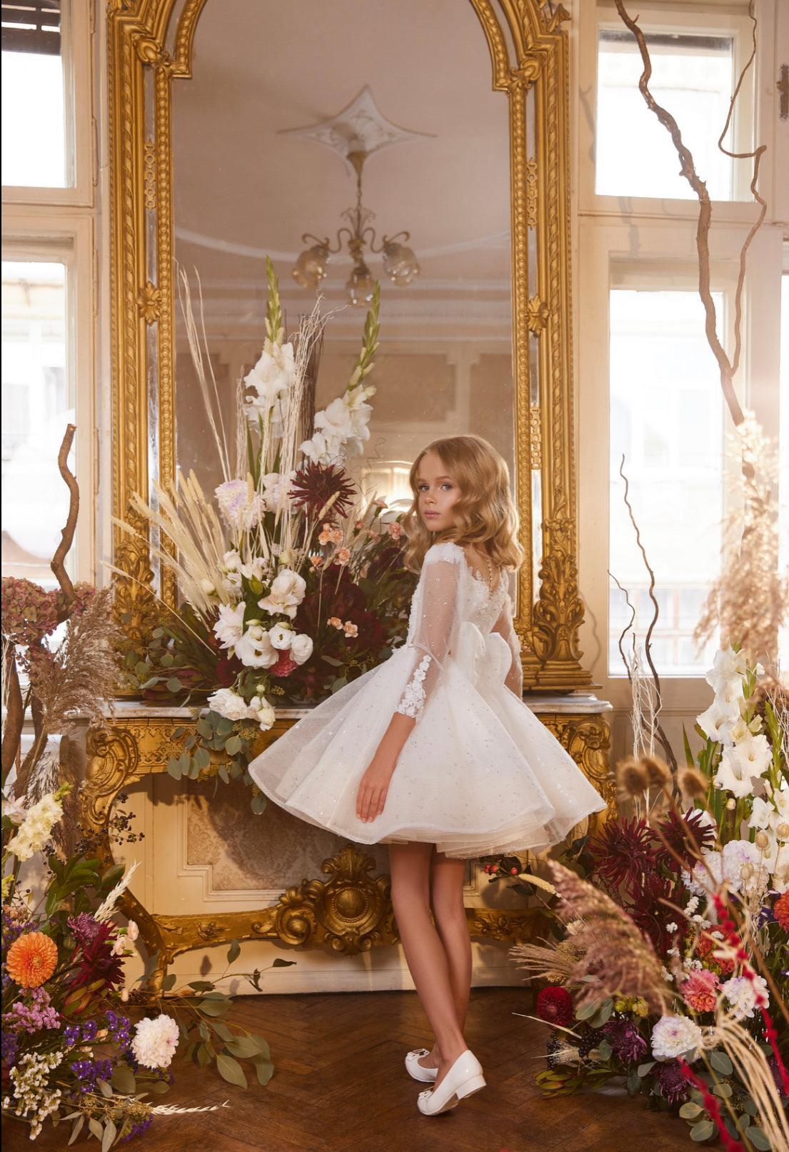 This cute dress will definitely please your Princess! The dress is made of shiny fabric with glitter and special sequins. The corset of the outfit has an original shape and is decorated with very beautiful lace with flowers. The flowers are embroidered with beads and shiny stones. The long sleeves are also adorned with lace at the cuffs. In a fluffy knee-length skirt, it is very convenient to dance and run with girlfriends and look luxurious at the same time! A stunning bow completes the look.