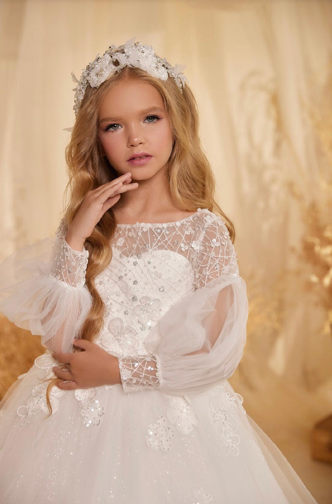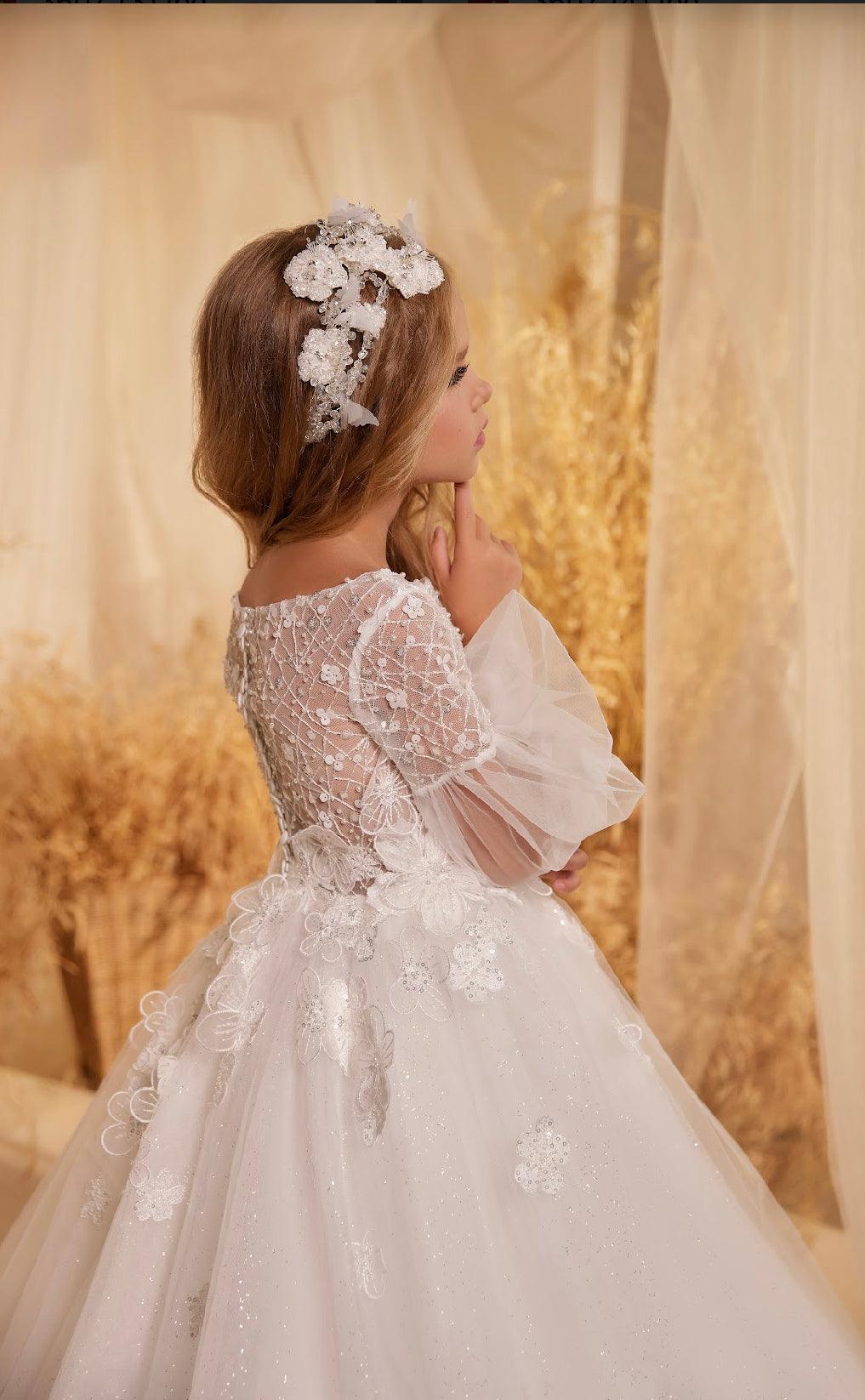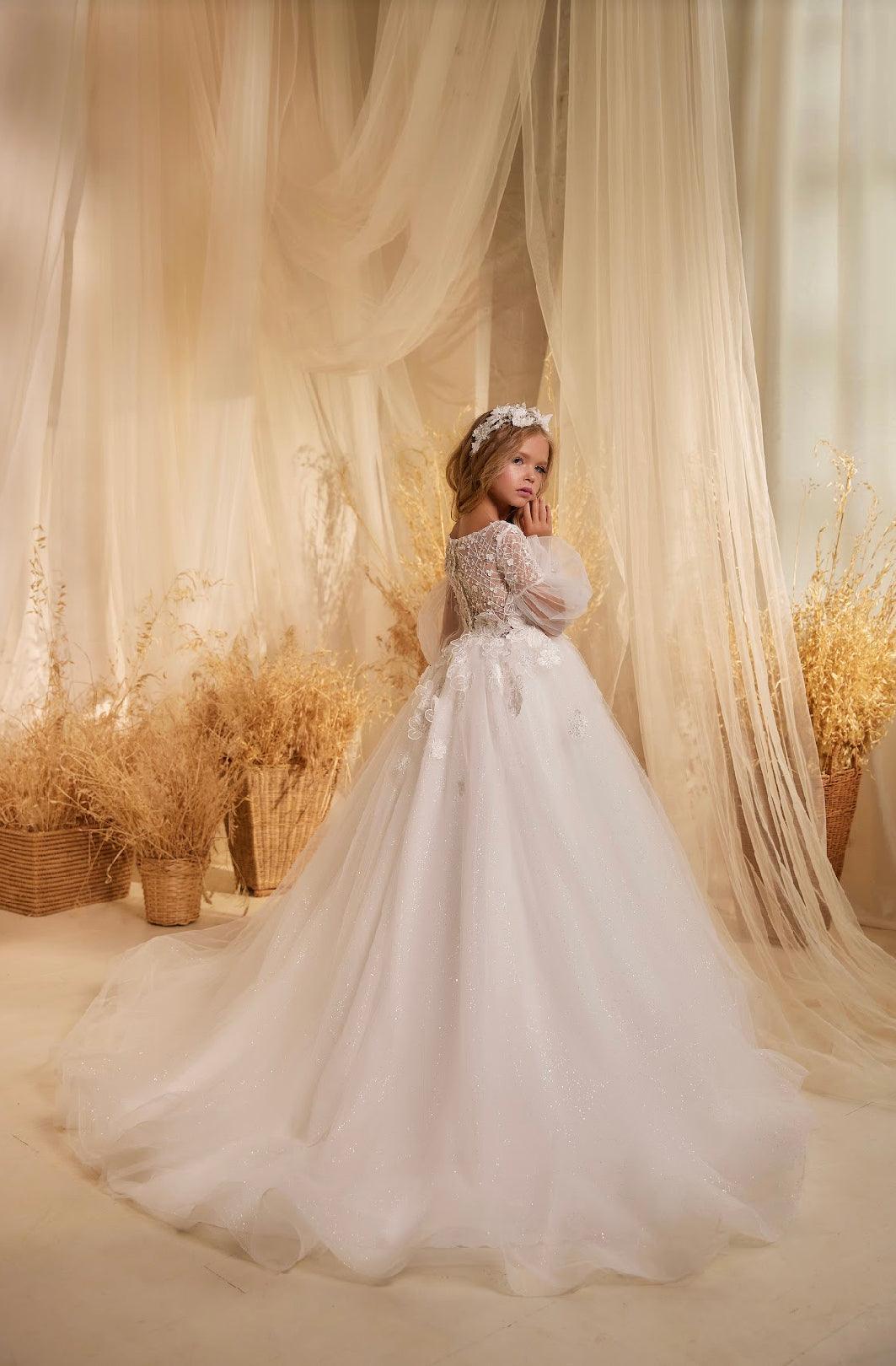 Given its intricate design and ethereal charm, this dress is ideally suited for grand occasions. Whether it's for a wedding, where your child takes on the role of a flower girl, significant milestones like First Communion, Christening, or even landmark birthday celebrations, this dress is set to be the highlight of the event. In it, your child will not only look breathtaking but also feel deeply cherished.