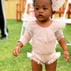 Paired with an oversized matching hair bow, adorned with subtle sparkles, this set is perfect for milestone photos, special occasions, or simply adding a touch of luxury to everyday wear. Whether she’s taking her first steps or dancing in the sunshine, this ensemble will make your little princess shine.
