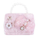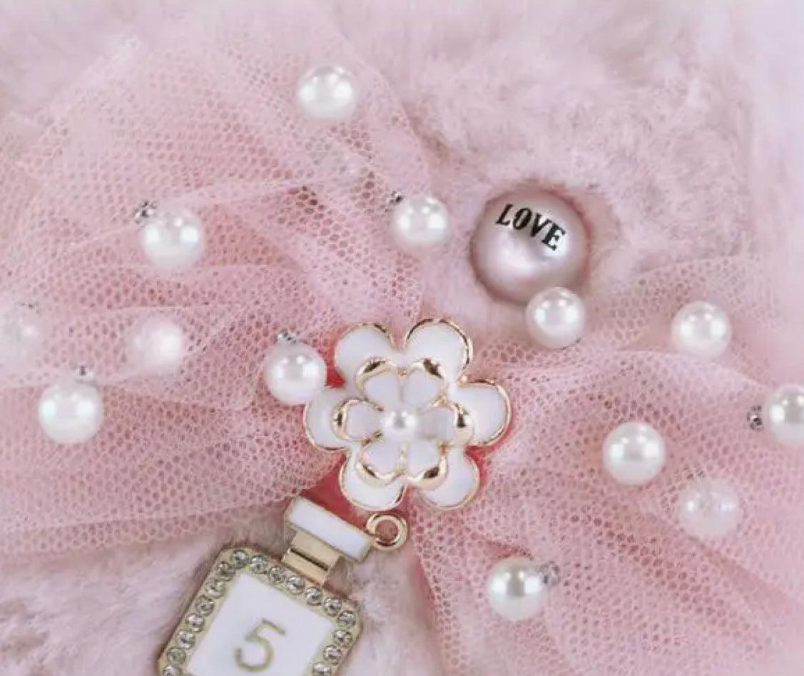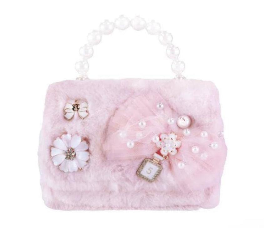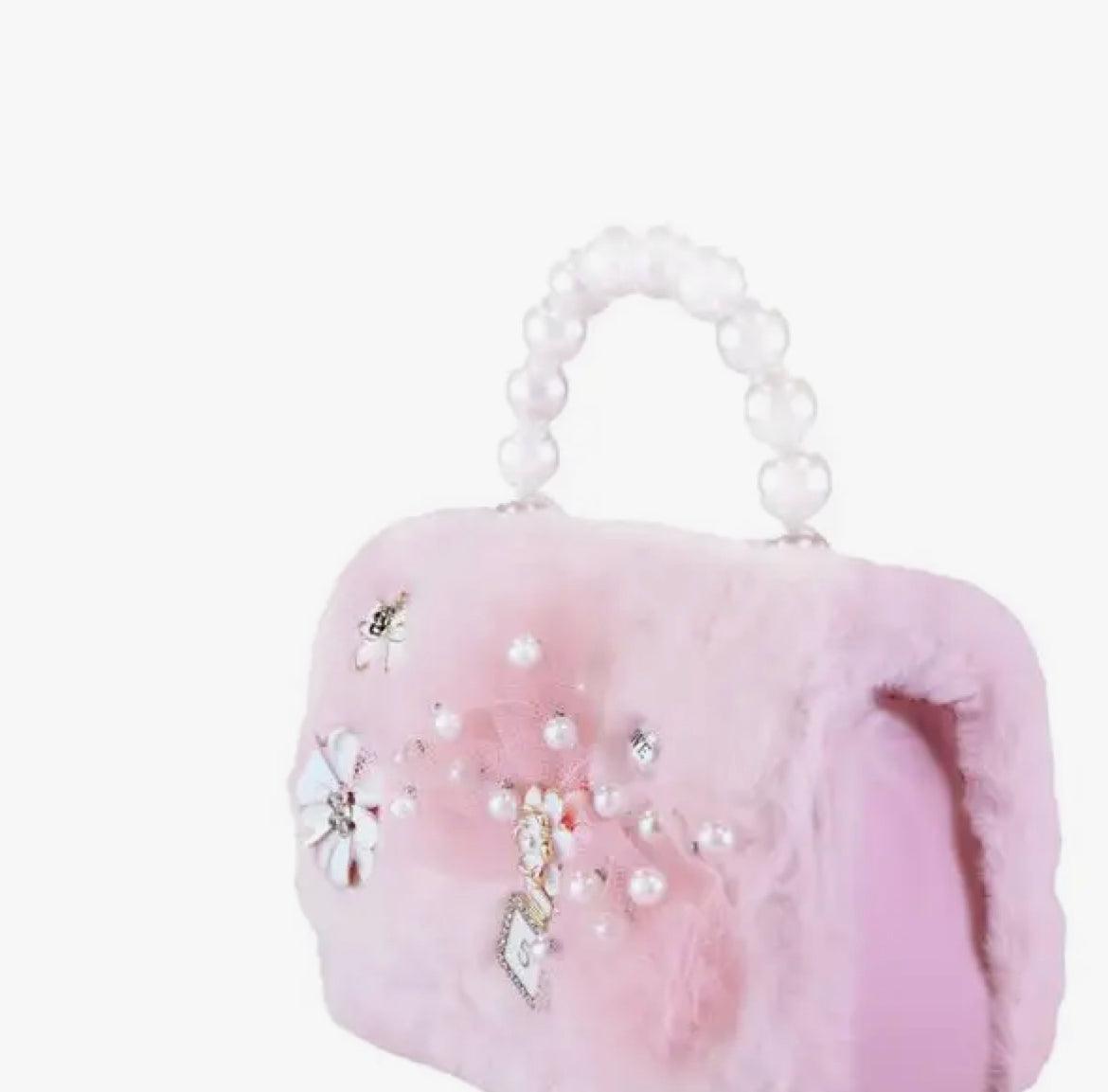 Bow & Floral Furry Purse with Pearl Handle with detachable gold chain. Dimension: 5.5" Length x 4" Height x 2.25" Width