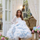 Descending from the fitted waist is a voluminous midi-length skirt, setting this piece apart with its whimsical charm. The skirt, crafted with layers of ruffled tulle, gives the dress an ethereal appearance. Each tier is carefully arranged to create a cascading effect, reminiscent of the petals of a blooming flower.