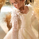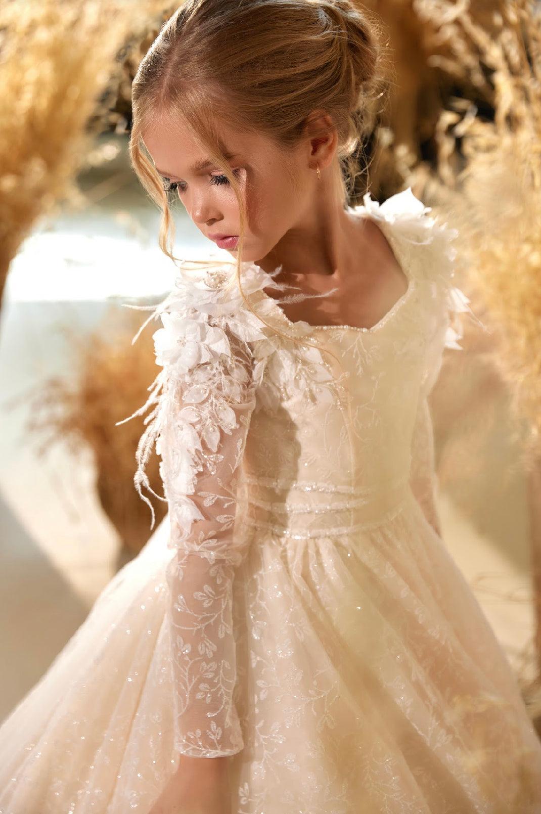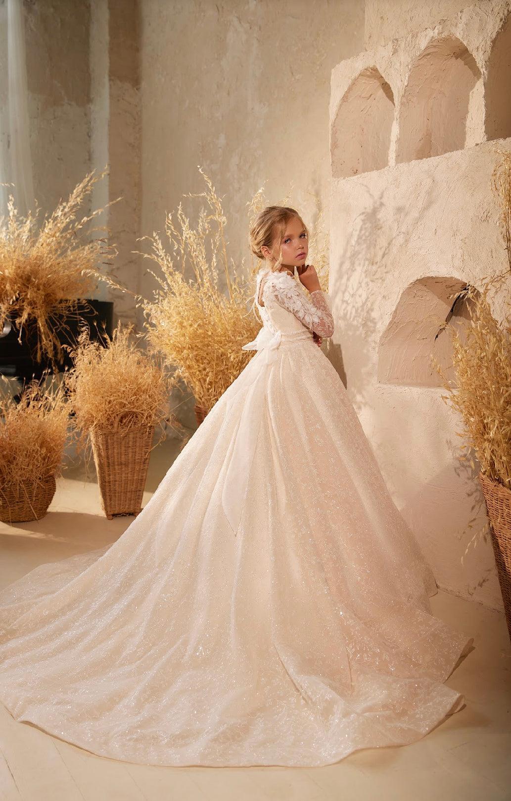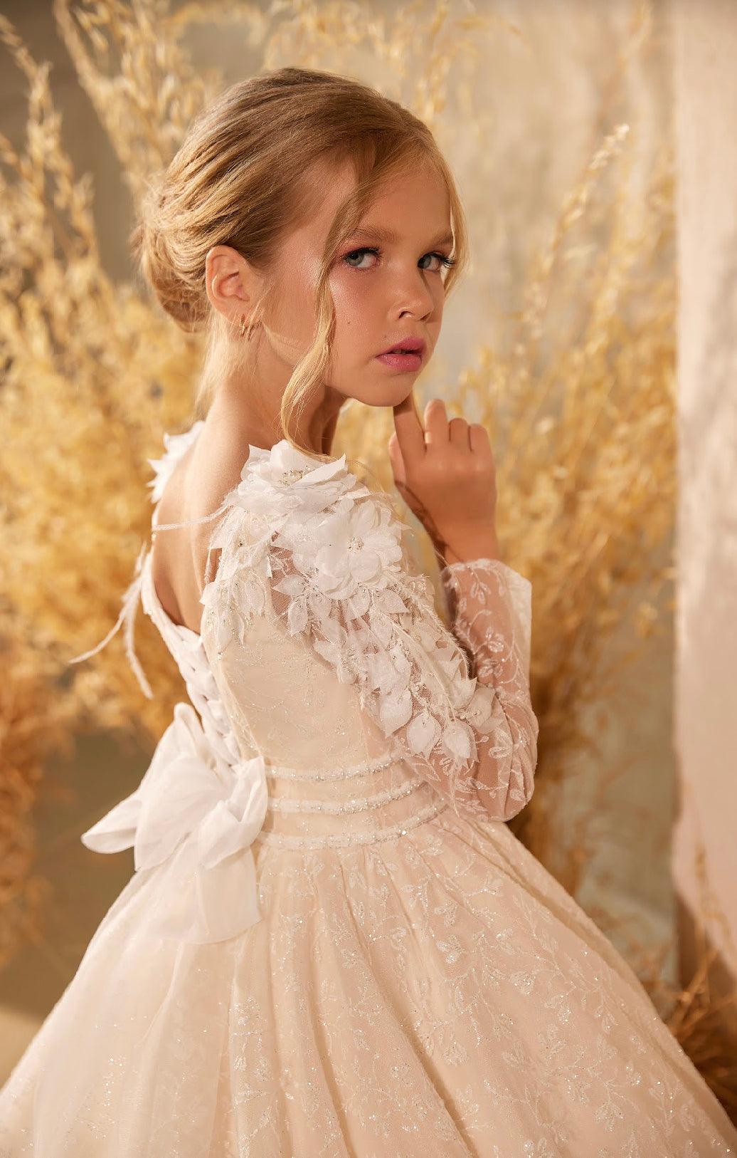 The Rosalie is an elegant flower girl dress that shines brightly, perfect for grand occasions. Its soft champagne color, combined with white and sparkly lace patterns, gives it a special and fancy appearance.