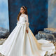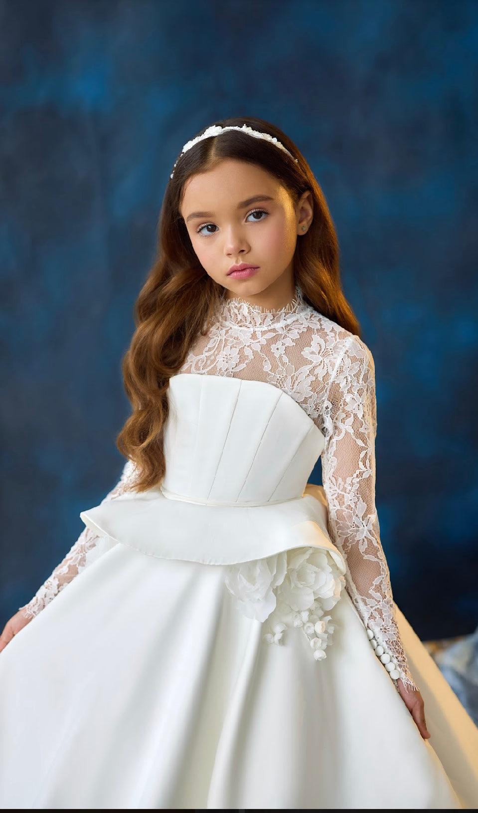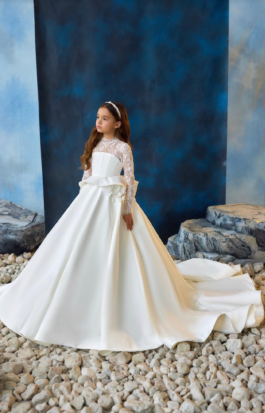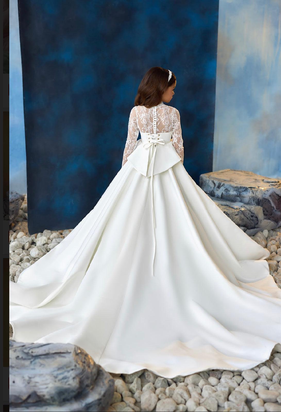 Sleeves & Neckline: The gown boasts long lace sleeves, providing a touch of modesty while maintaining its elegant design. The high neckline is both sophisticated and timeless, adorned with delicate lace that flows seamlessly into the bodice.