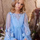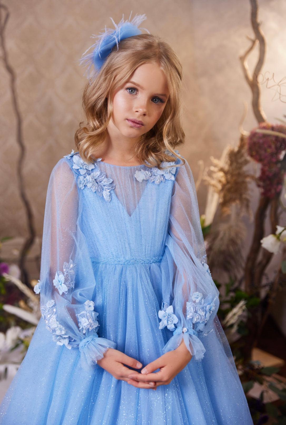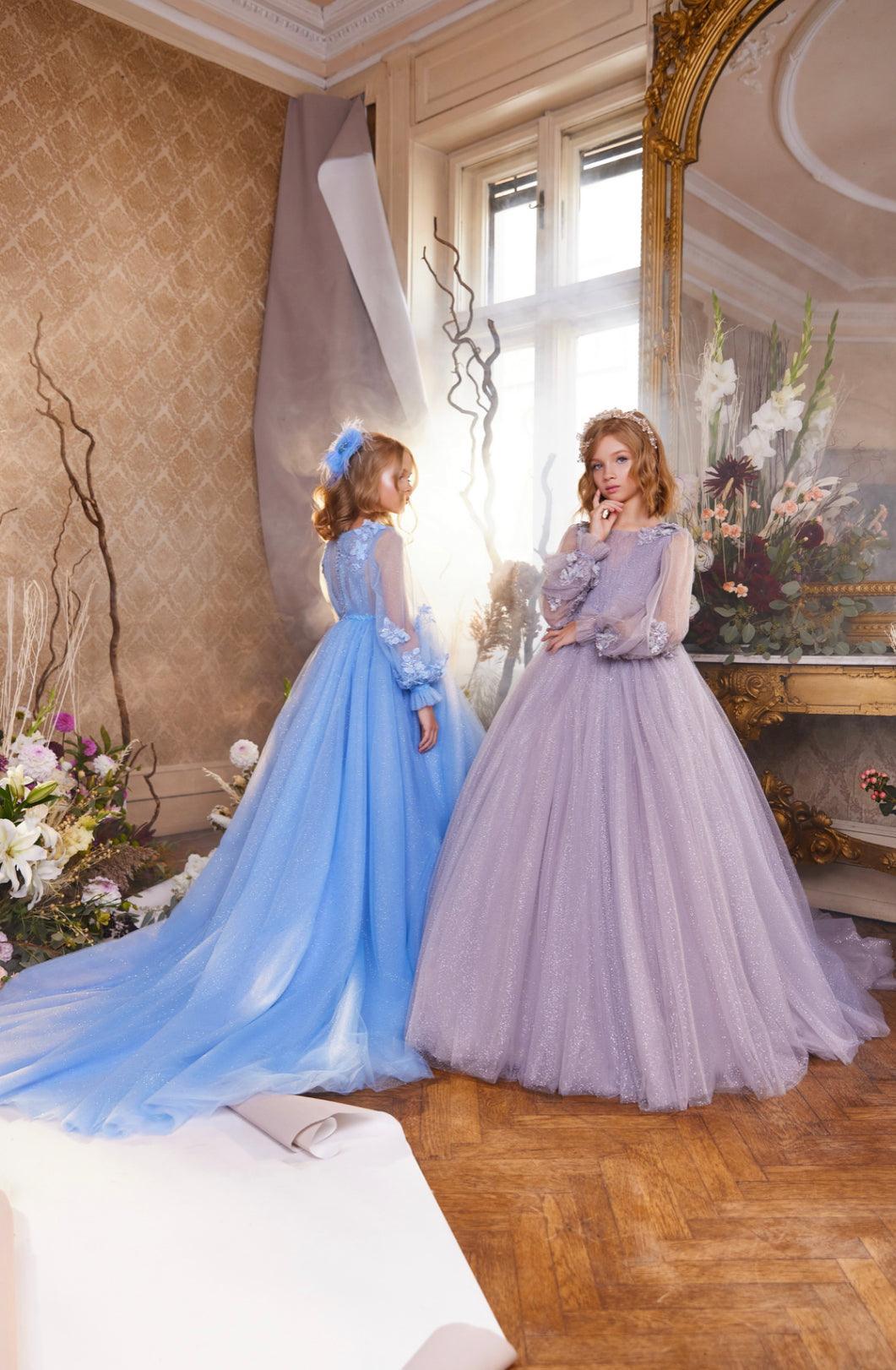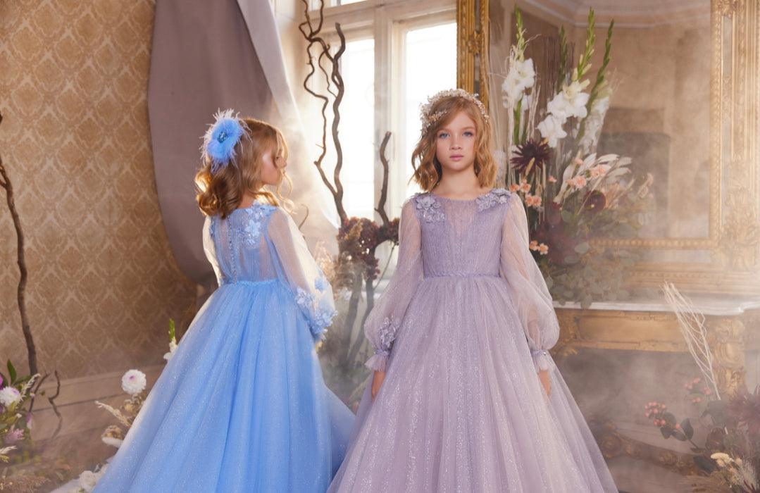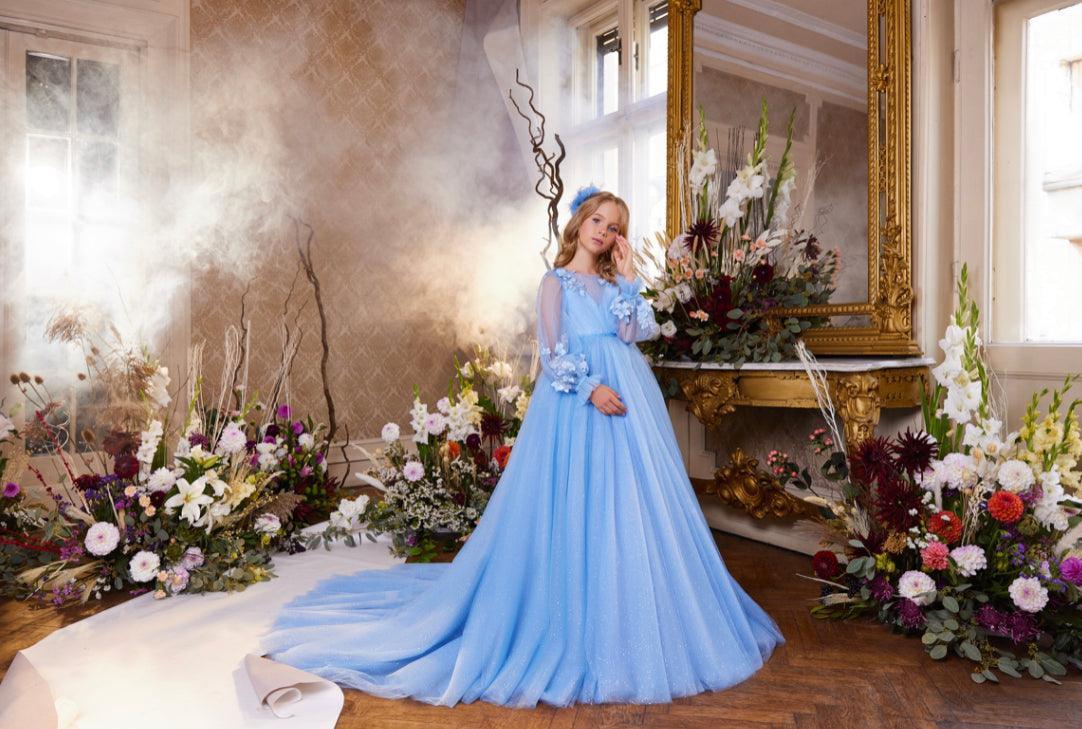 These ethereal gowns, available in enchanting shades of powder blue and lilac, are designed for little royals who desire elegance and grace. Each dress features a fitted bodice adorned with delicate floral lace appliqués and glittering accents that shimmer with every movement. The illusion neckline and sheer long sleeves add a touch of sophistication, while the flowing, voluminous skirt cascades into a regal train that creates a breathtaking silhouette.