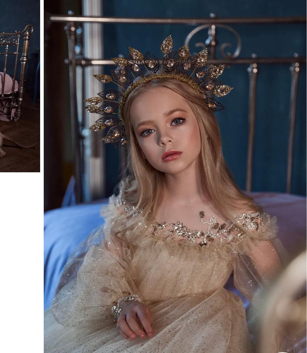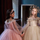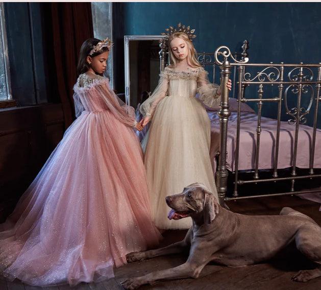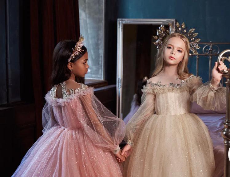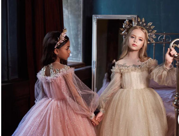 This lovely long tulle dress for girls is available in blush/pink shades as well as white, ivory, or cappuccino. She will undoubtedly feel like a true princess in this exquisite ball gown featuring an illusion off-the-shoulder neckline and long sheer sleeves, which are gathered at cuffs. Exquisite lace-work, rhinestones, and frills frame the shoulder line. The softly pleated corset bodice is contoured by tiny beading along the waistline. 3112 long tulle dress is a long puffy ball gown made of yards of light tulle with a hint of shimmer.