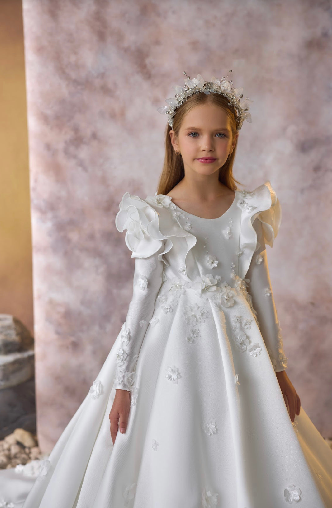 Crafted with meticulous attention to detail, the gown boasts intricately layered ruffled sleeves and delicate floral appliqués adorning the bodice and skirt. The long flowing skirt cascades gracefully, with scattered 3D floral accents that create a sense of movement and magic. The gown's fitted bodice, complemented by sheer long sleeves, provides an elegant and classic silhouette that exudes charm.