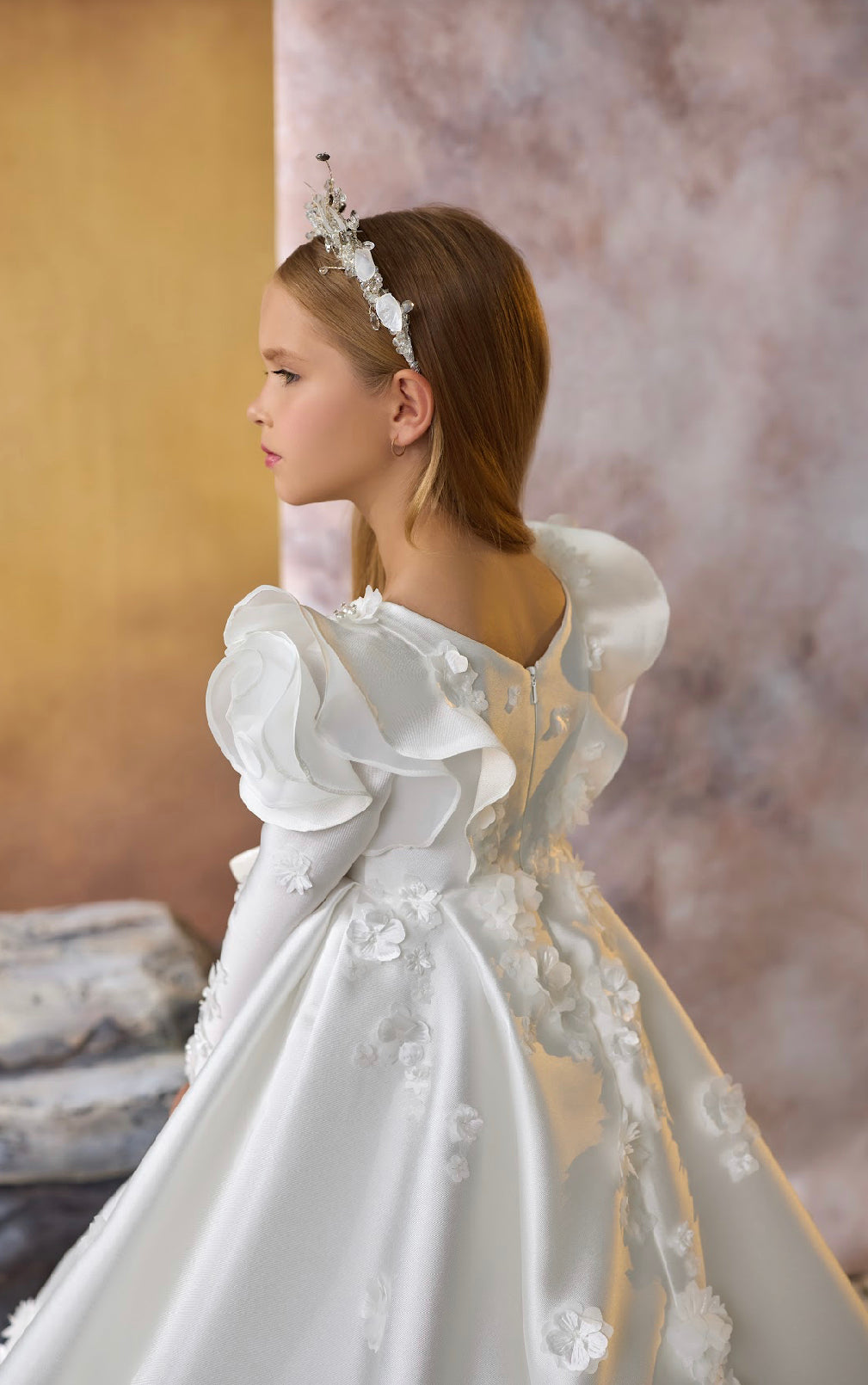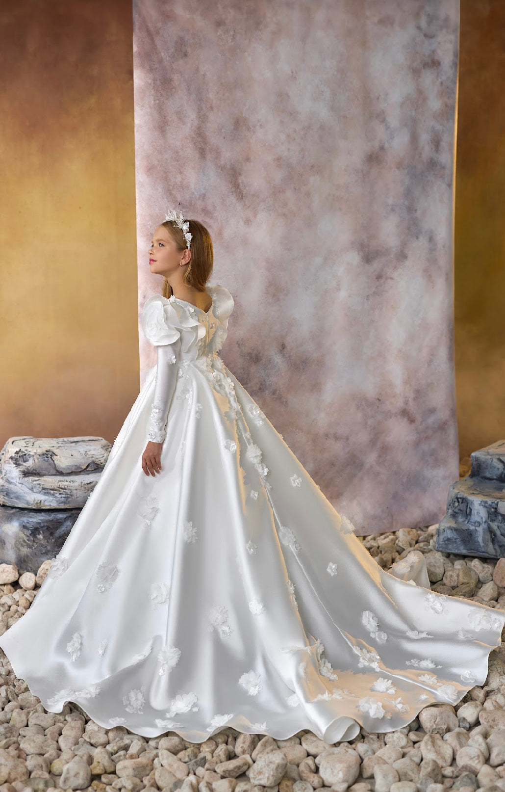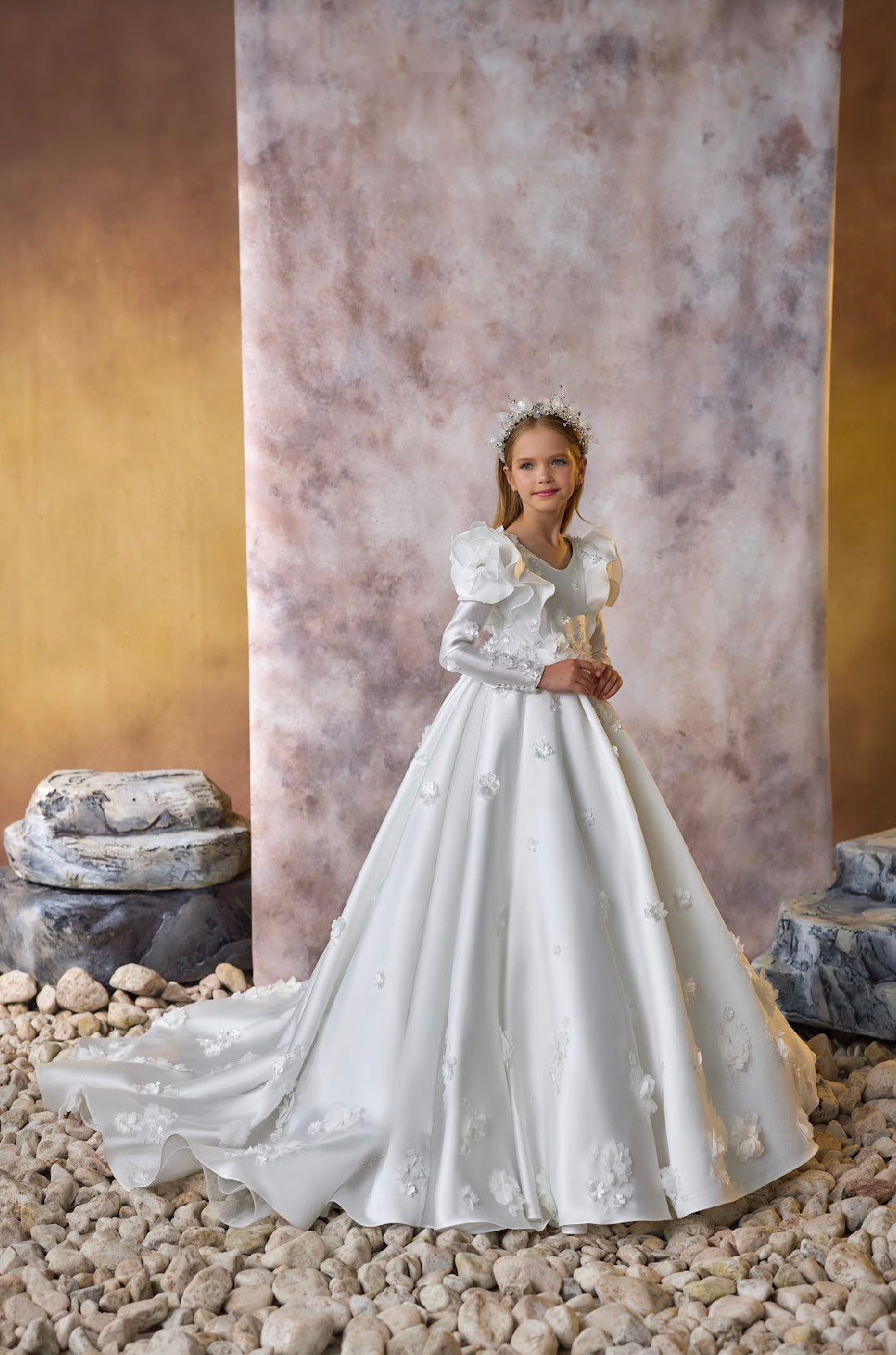 Accentuated with an intricately designed floral headpiece, this dress ensures your little princess stands out in any royal event, celebration, or photoshoot. The Regal Blossom Gown is more than a dress—it’s a statement piece that embodies grace, confidence, and timeless beauty.