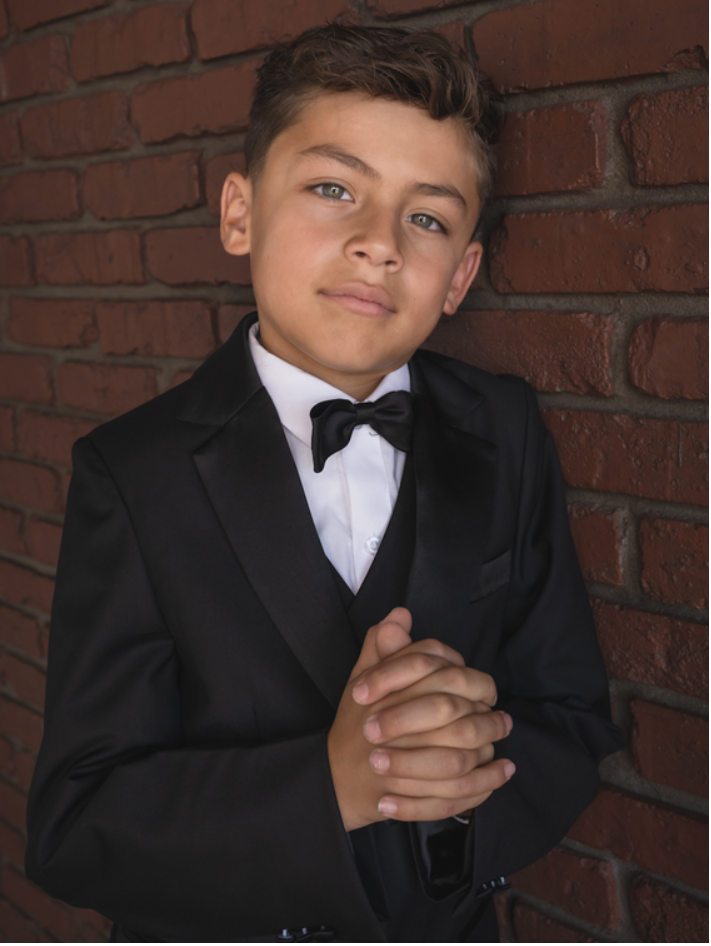 Pair with black dress shoes and a confident smile for a look that turns every entrance into a moment. Whether he’s escorting the flower girl or standing at center stage, the 007 Black Tuxedo guarantees a picture-perfect presence.