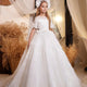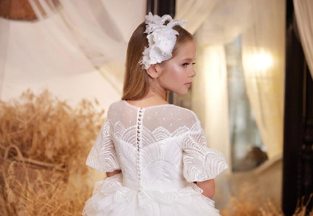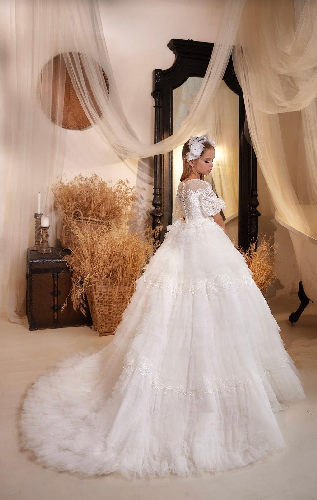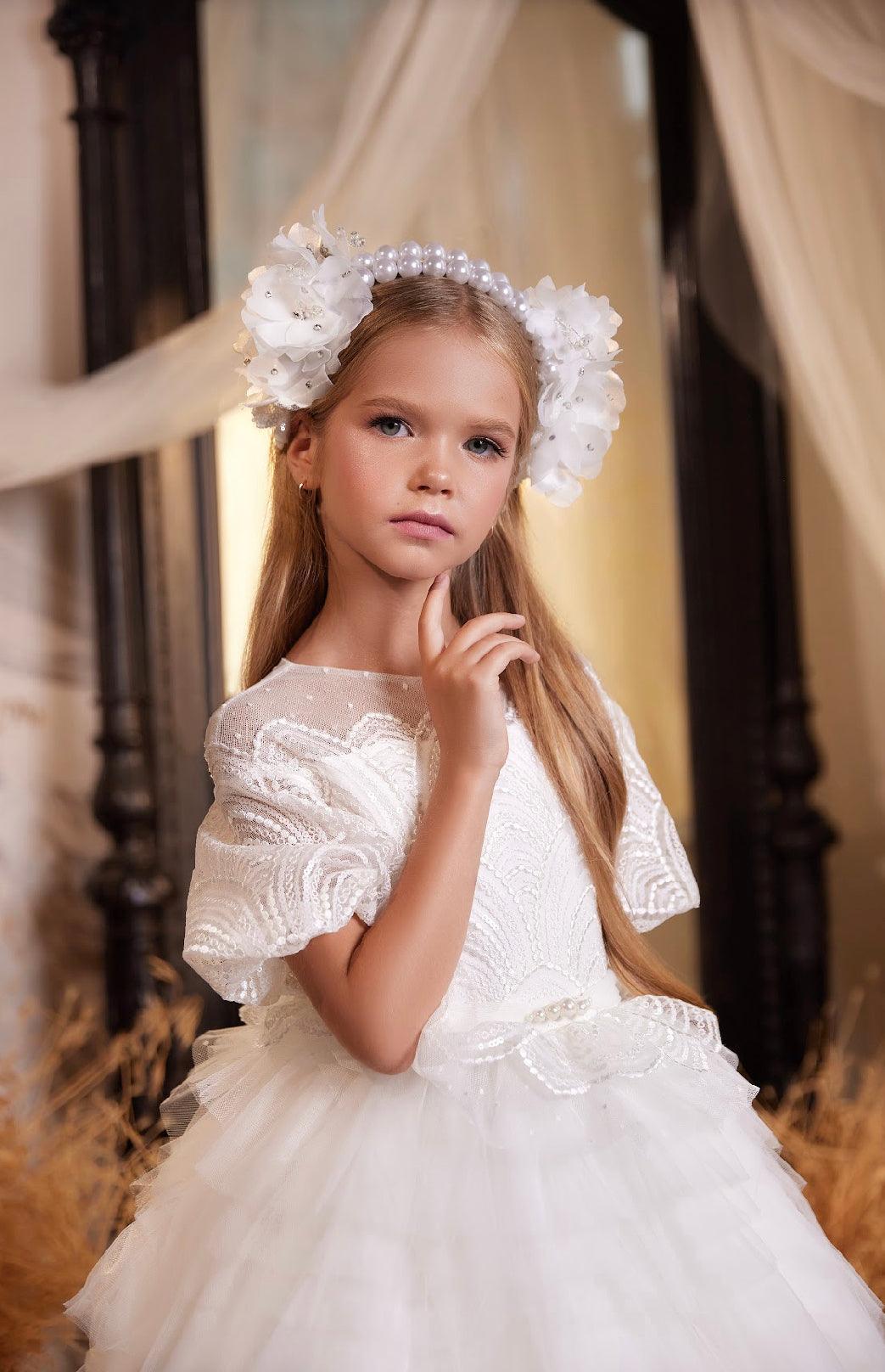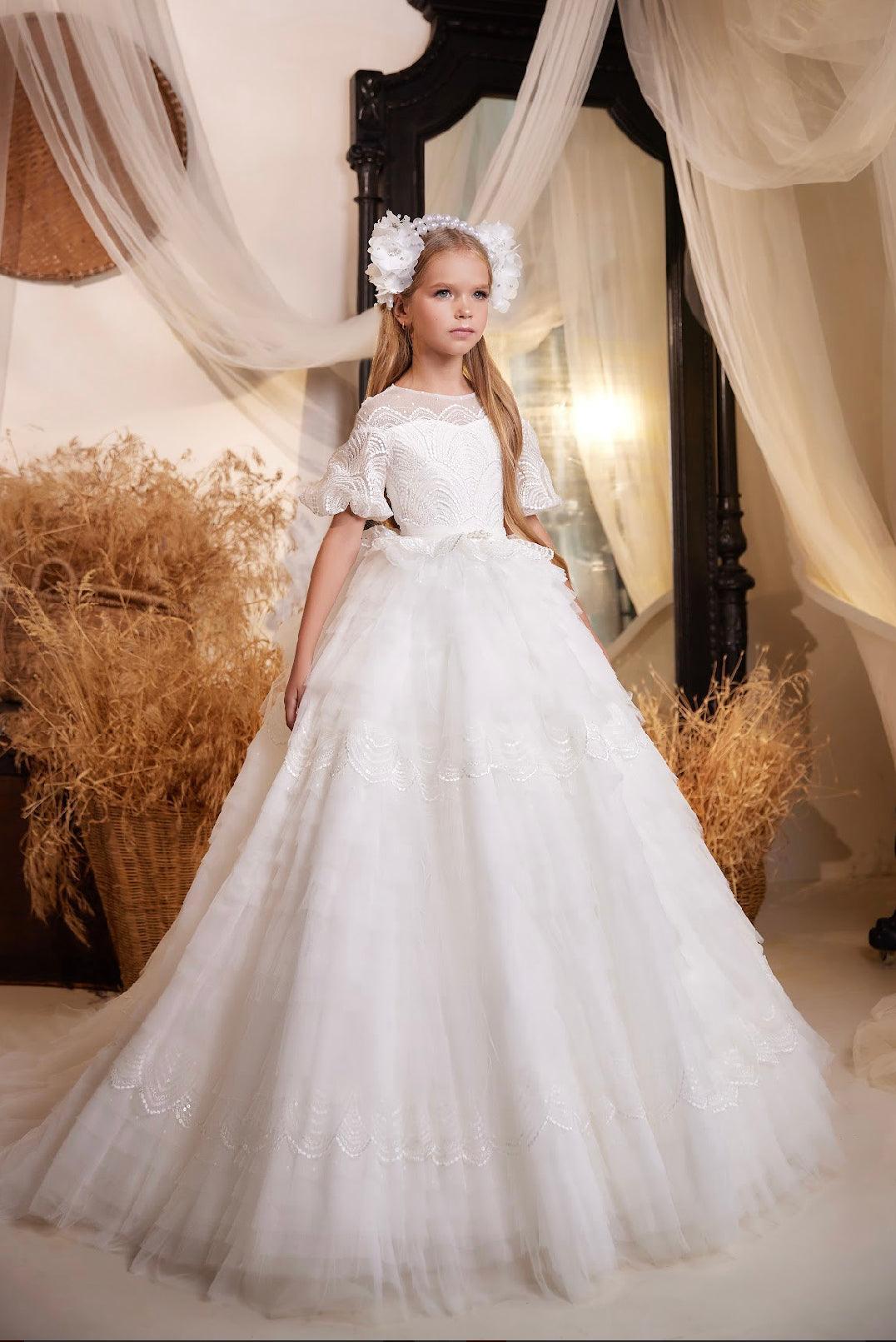 This flower girl dress is a short-sleeved gown exuding timeless beauty, making it perfect for a young girl attending a grand celebration.