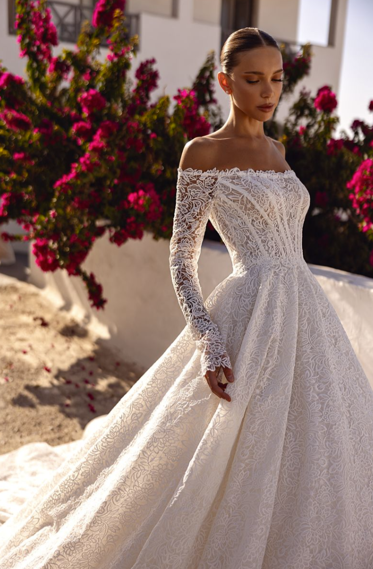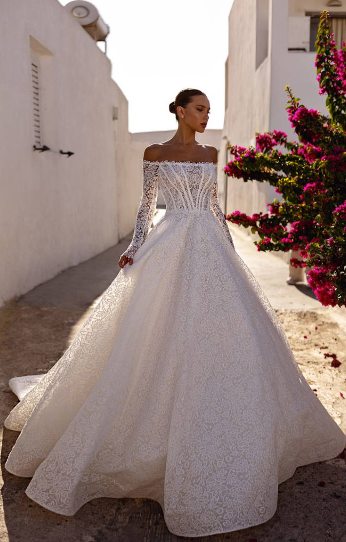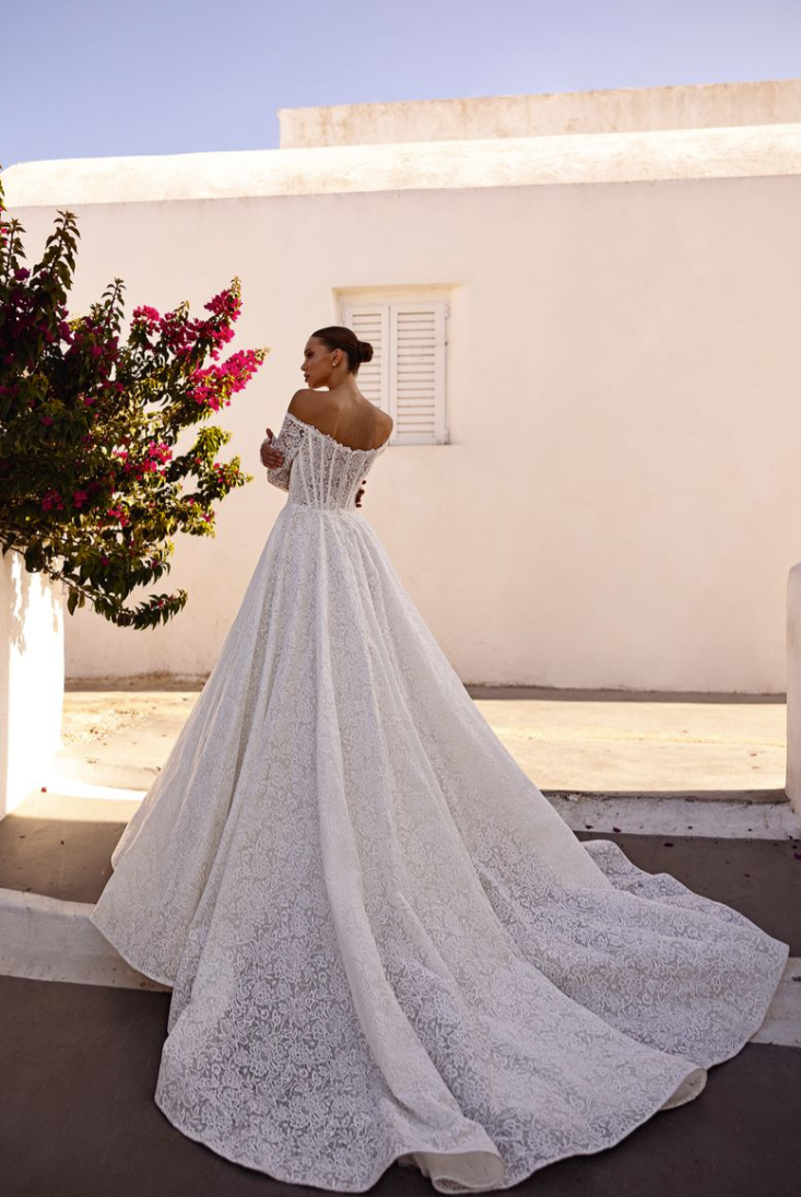 Style Inspiration: Pair this gown with vintage pearl drop earrings, a sleek low chignon or romantic twisted bun, and a cathedral-length lace veil for a look that radiates fairytale opulence. Perfect for a garden estate wedding, a candlelit cathedral ceremony, or an elegant château affair.
