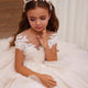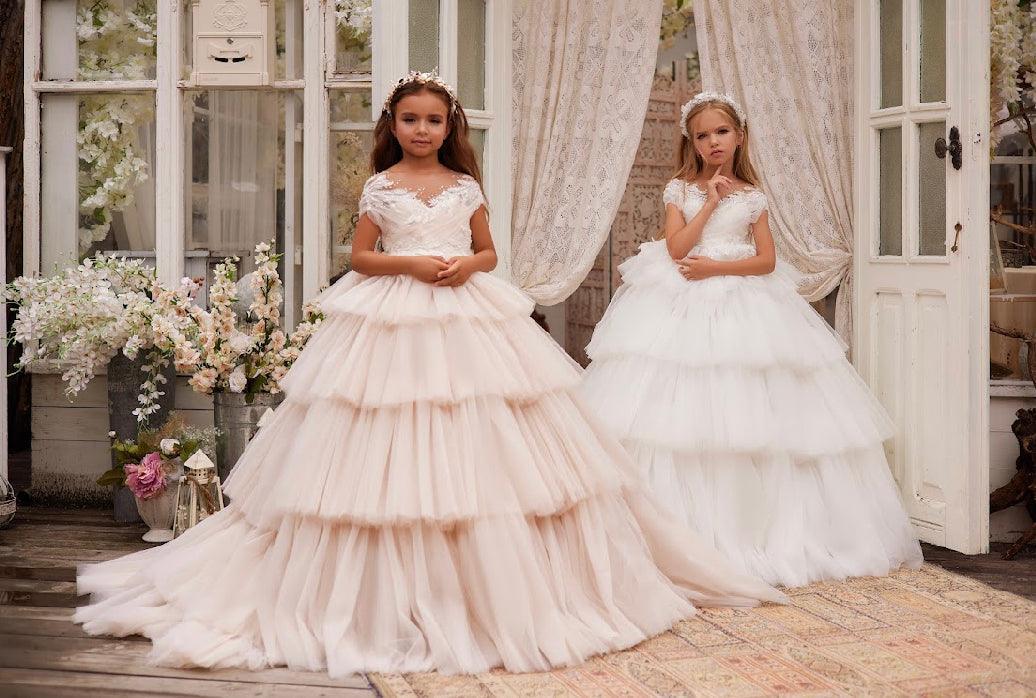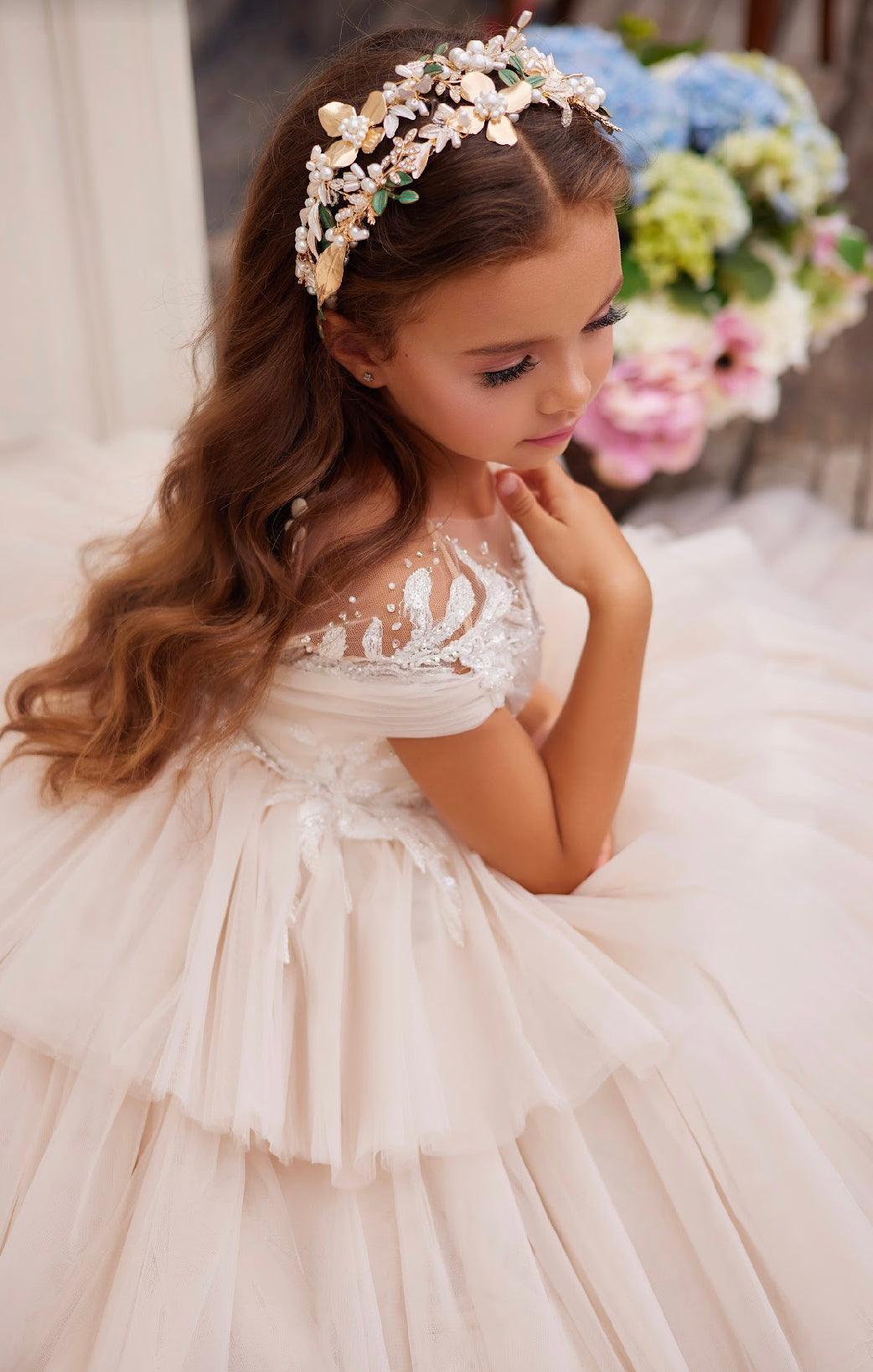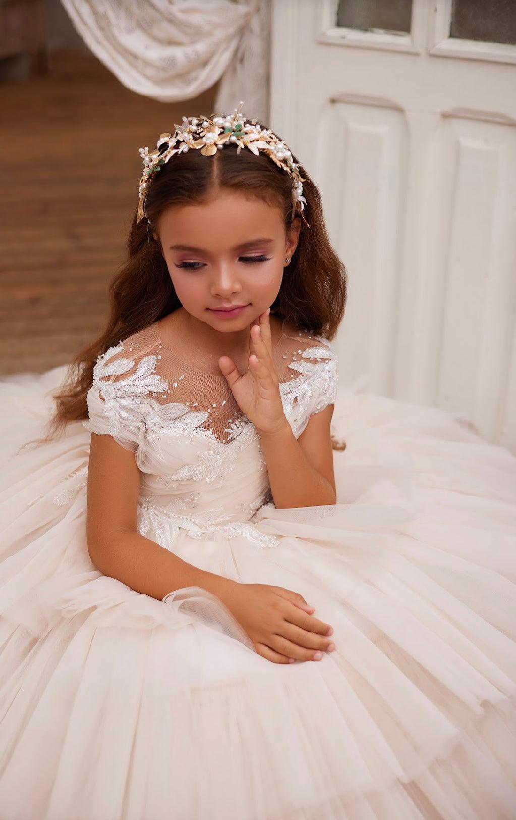Every detail, from the crisscross pleating of the bodice to the tiered ball gown skirt, has been meticulously crafted, ensuring the young wearer feels like royalty on her special day.