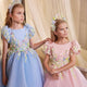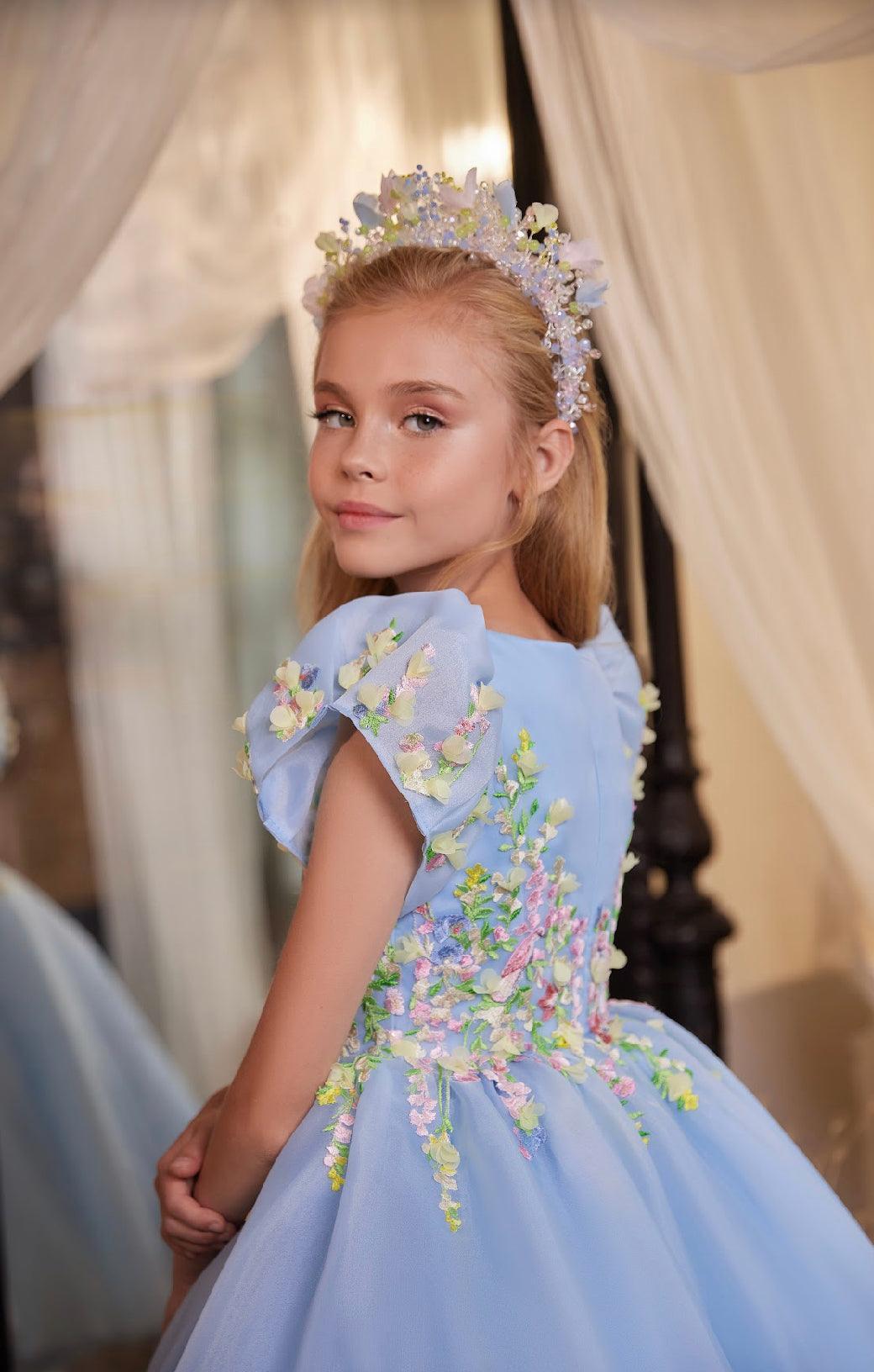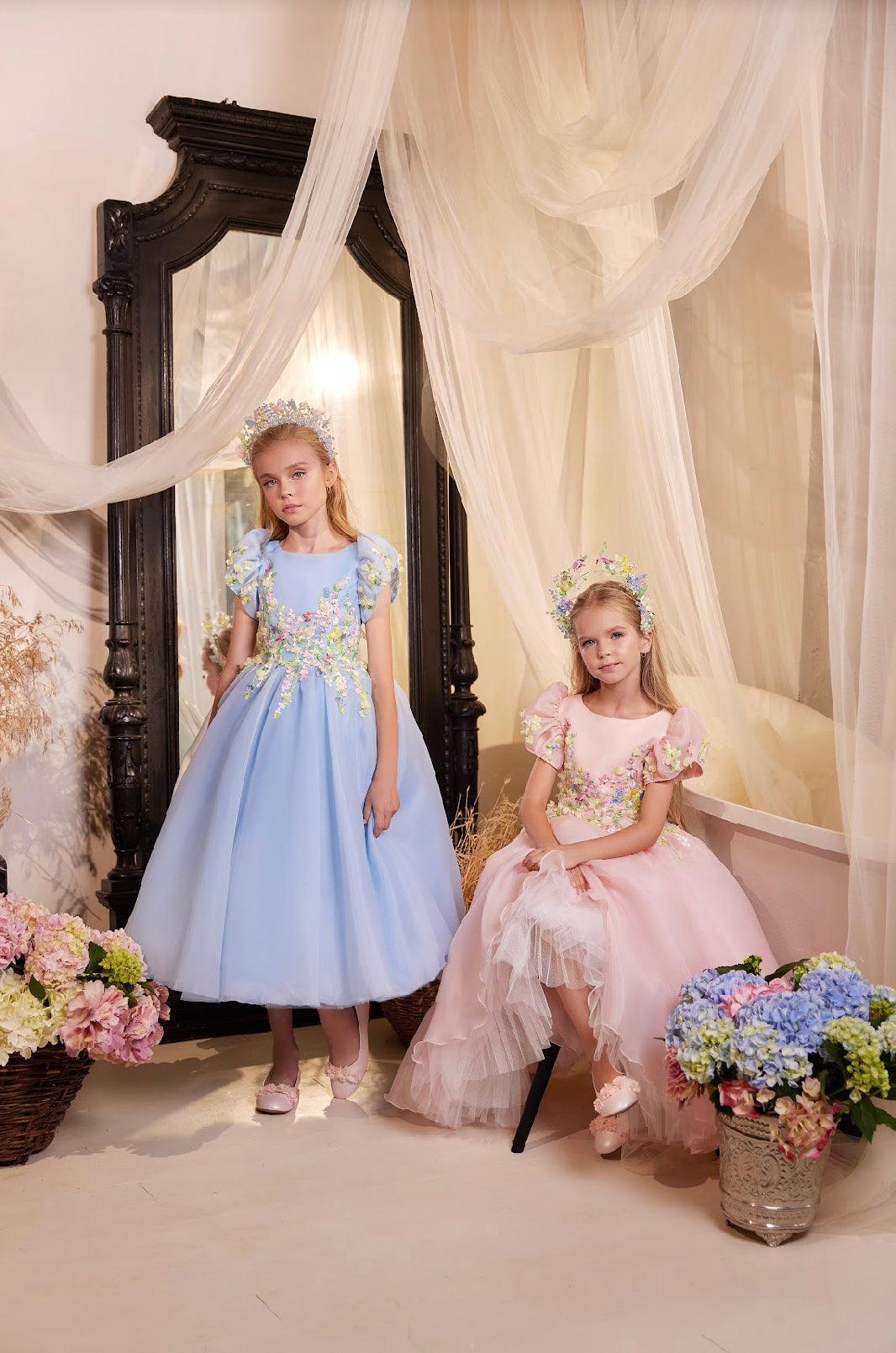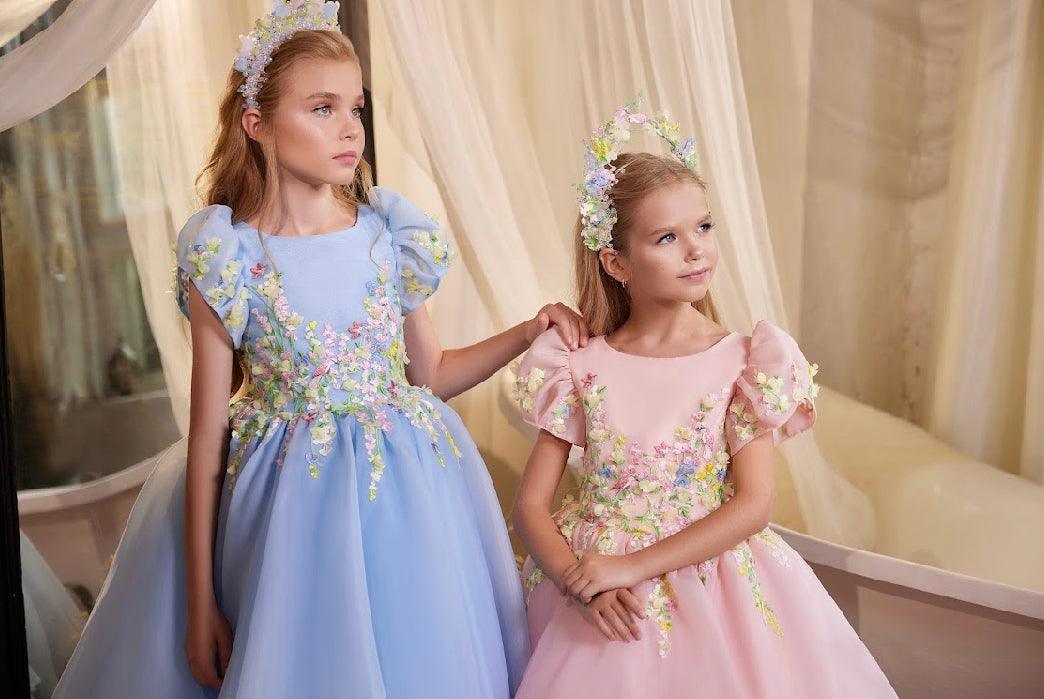 The Annalise dress exudes youthful elegance, making it a perfect choice for flower girls. Available in a delicate shade of pink or powder blue, it's embellished with vivid floral appliqués. Tailored for various special occasions, it's particularly suited for milestone birthday celebrations, garden parties, Easter, religious festivities and as standout attire for flower girls at grand weddings.