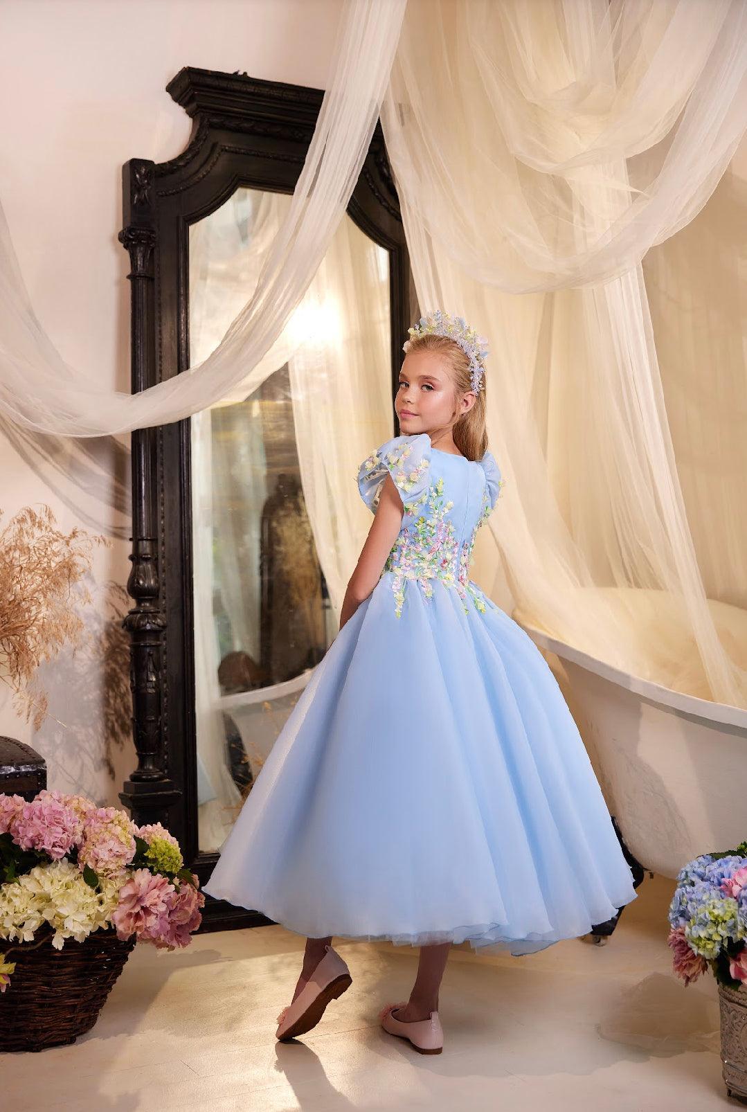 The dress is a delicate and ethereal creation in a soft shade of powder blue. It features a fitted bodice adorned with intricate floral appliques in pastel hues. These appliques, ranging from blossoms to tiny petals, are meticulously detailed and provide a sense of depth and texture to the garment. Puffed, short sleeves drape elegantly over the shoulders, echoing the airy aesthetic of the dress.