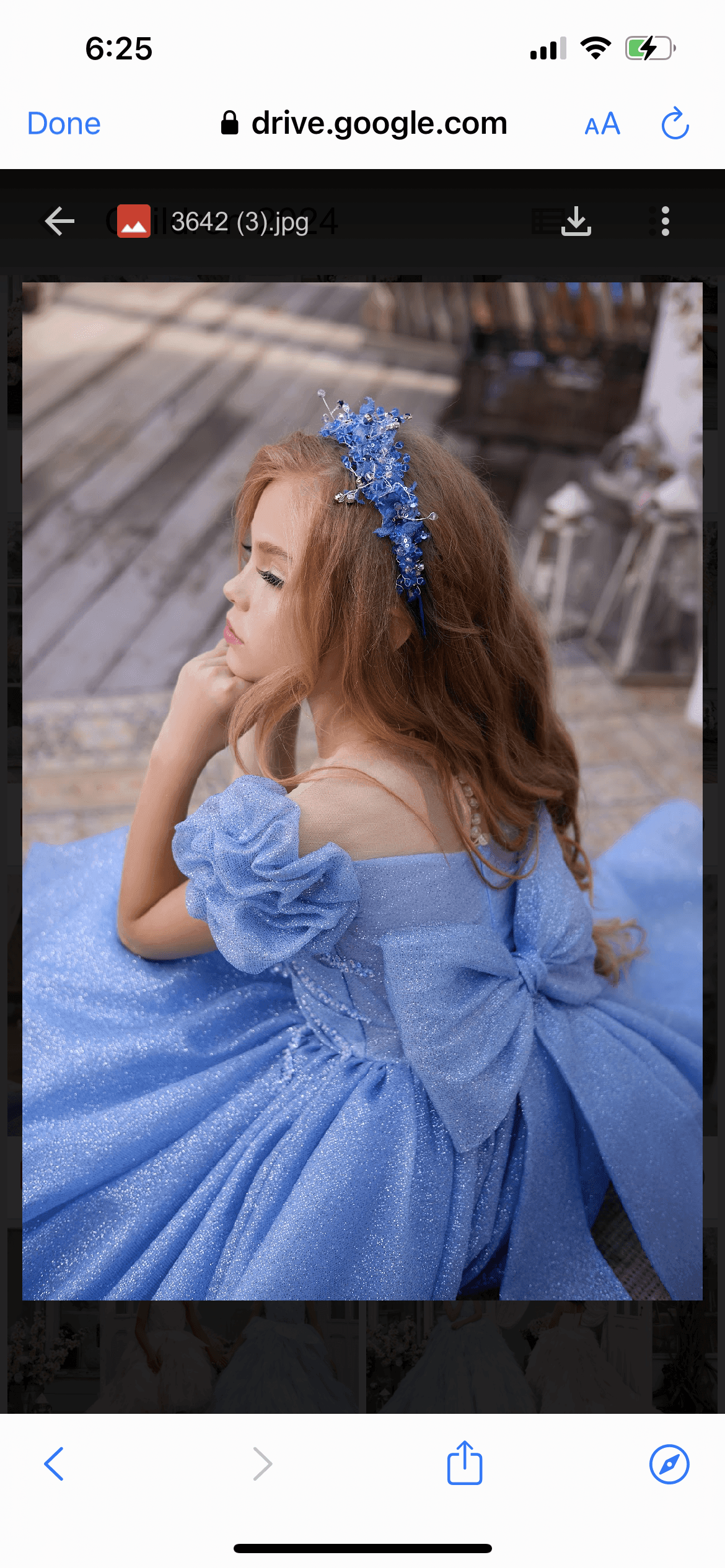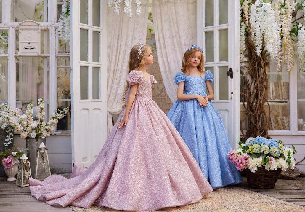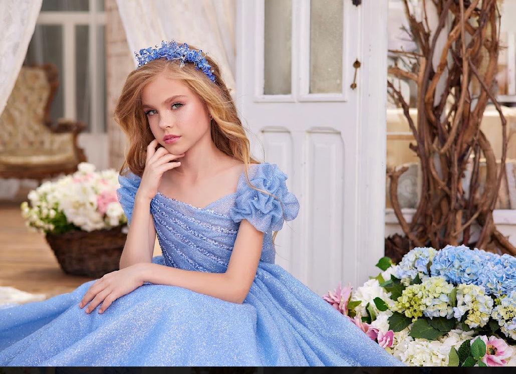 This Aurelia flower girl ball gown is bathed in a mesmerizing bright blue hue. Crafted from high-quality, glitter-infused fabric, it radiates a subtle shimmer that captures and reflects light, ensuring that your little one is the center of attention.