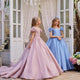 The gown's skirt cascades down gracefully, crafted from the same glittered fabric. Its voluminous design is supported by layers of tulle underneath, adding to its princess silhouette. A gorgeous zip-up back with a lovely bow completes the look.