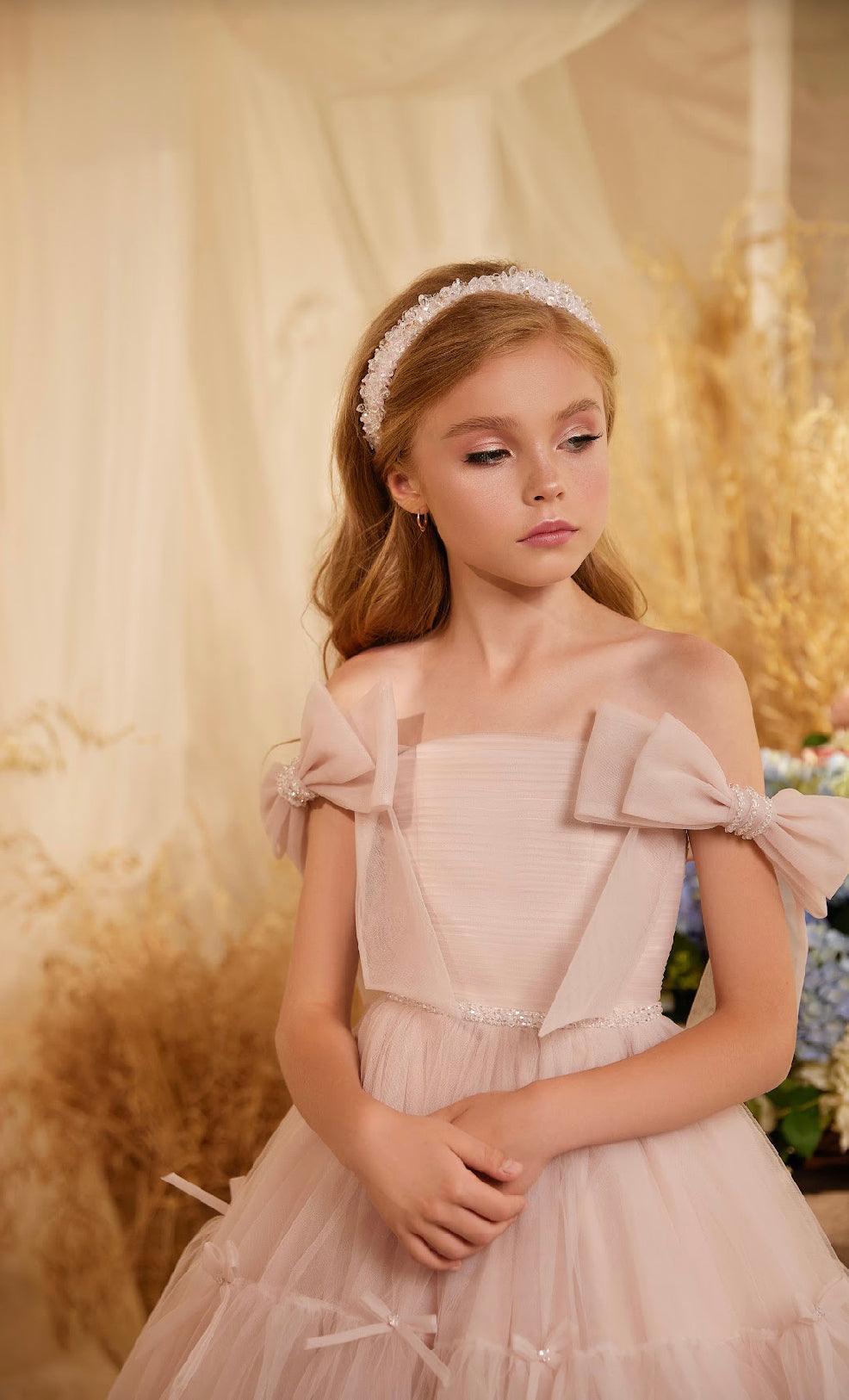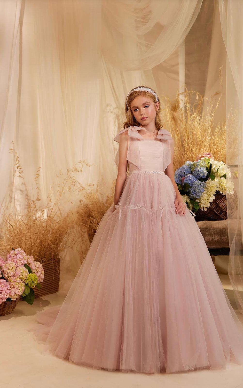 The Billie dress, tailored for a young lady, exudes delicate charm. In a soft blush pink hue, it embodies youthful elegance.