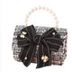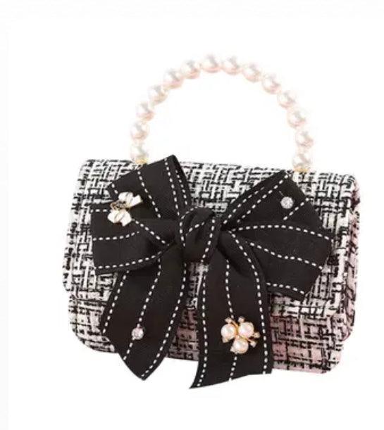 Finish your princess look with this black and white tweed purse with faux pearl handle and attached gold chain with big, embellished bow.