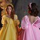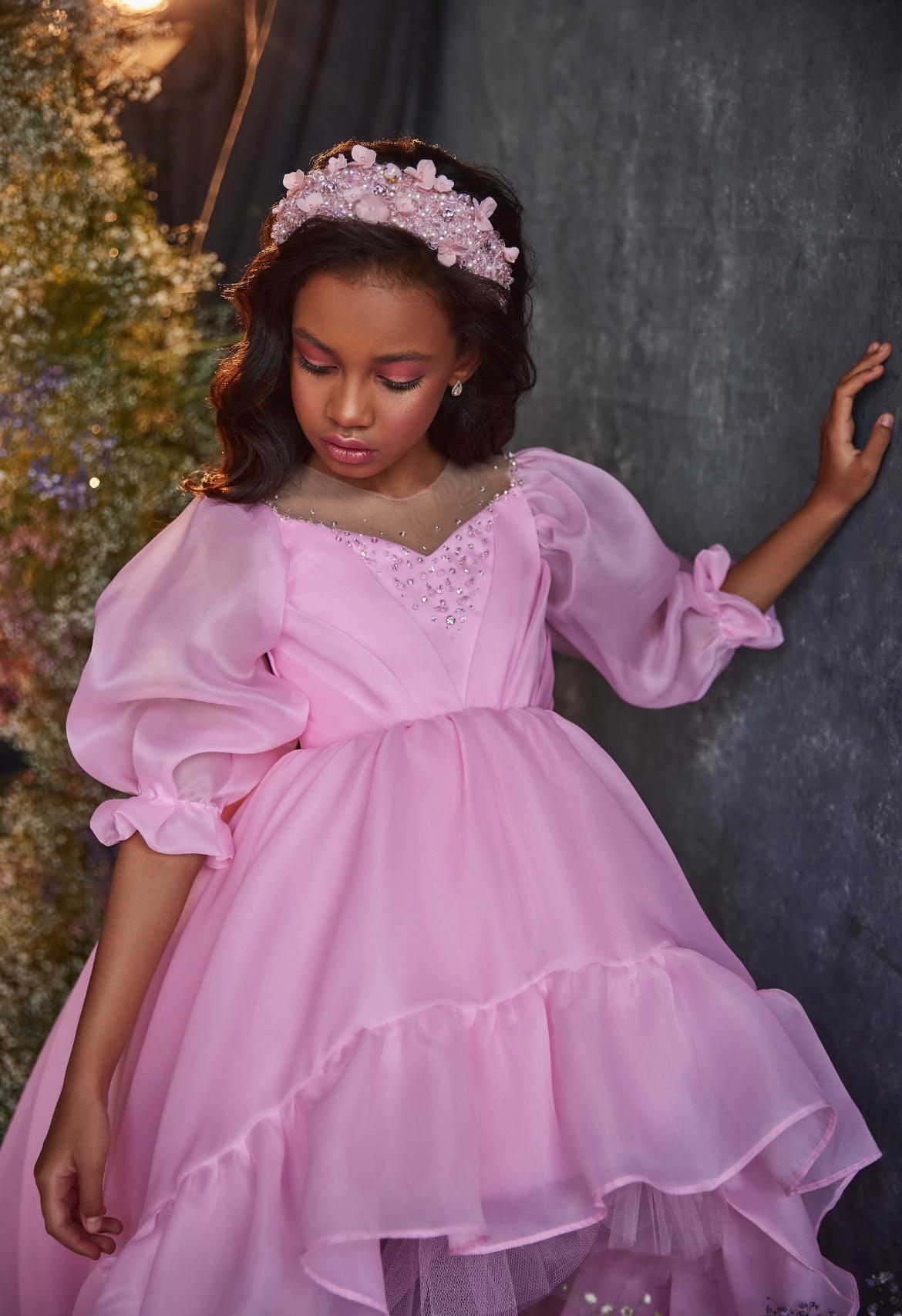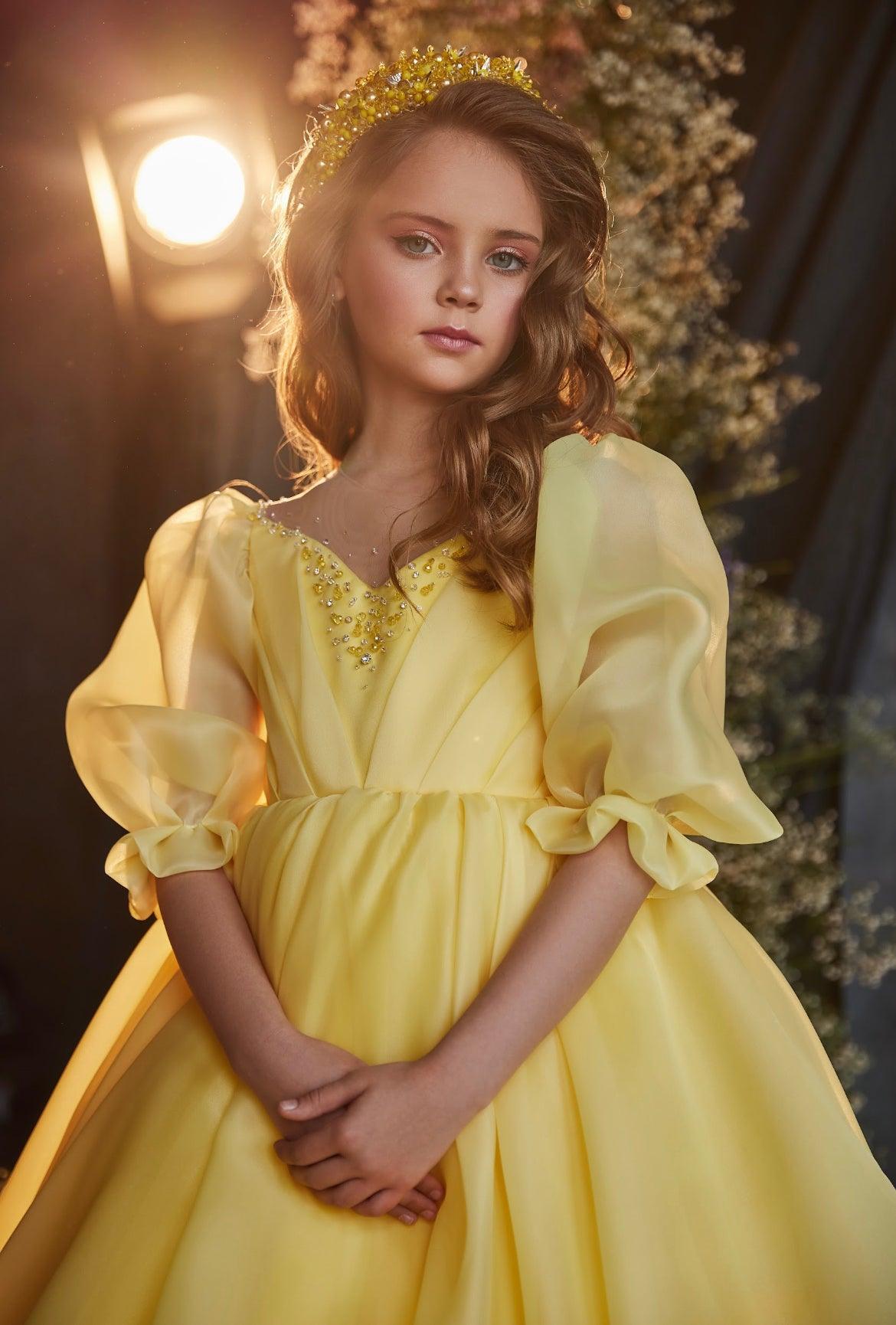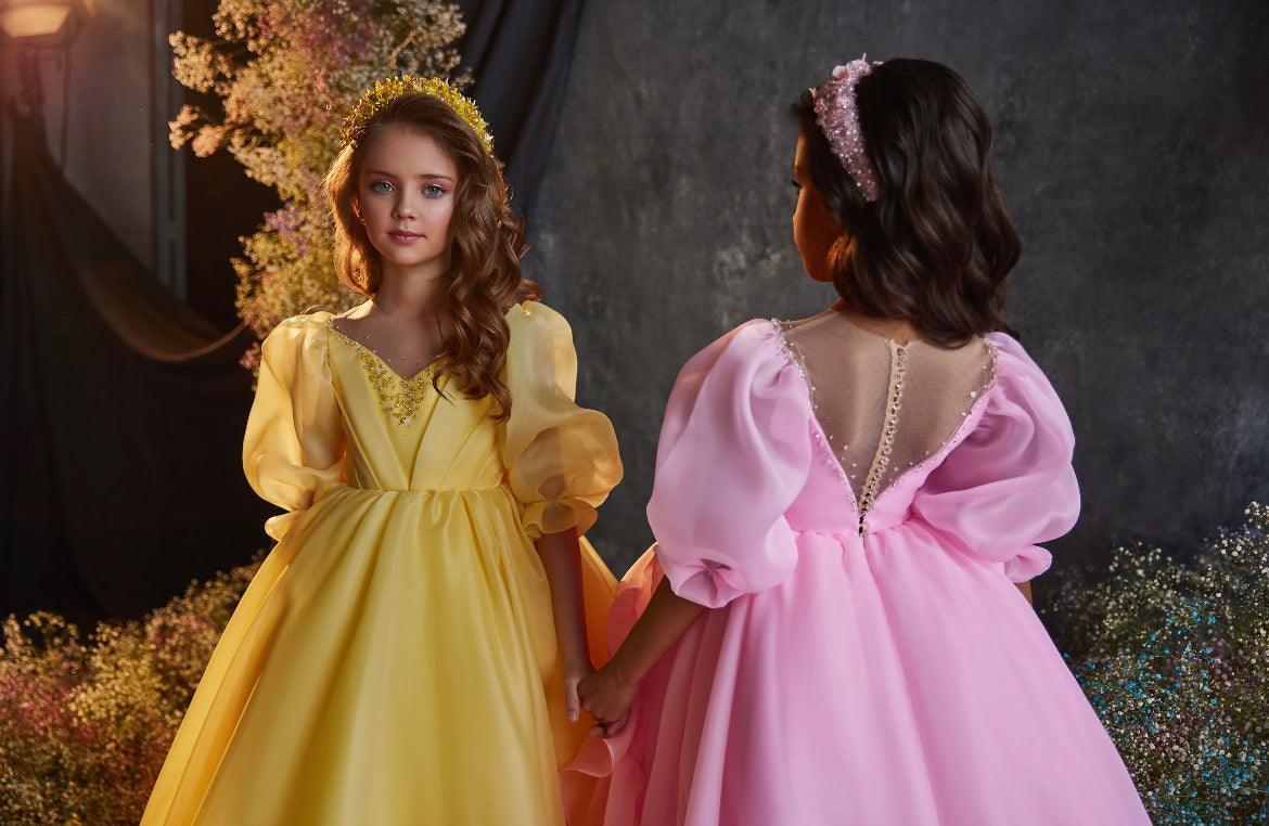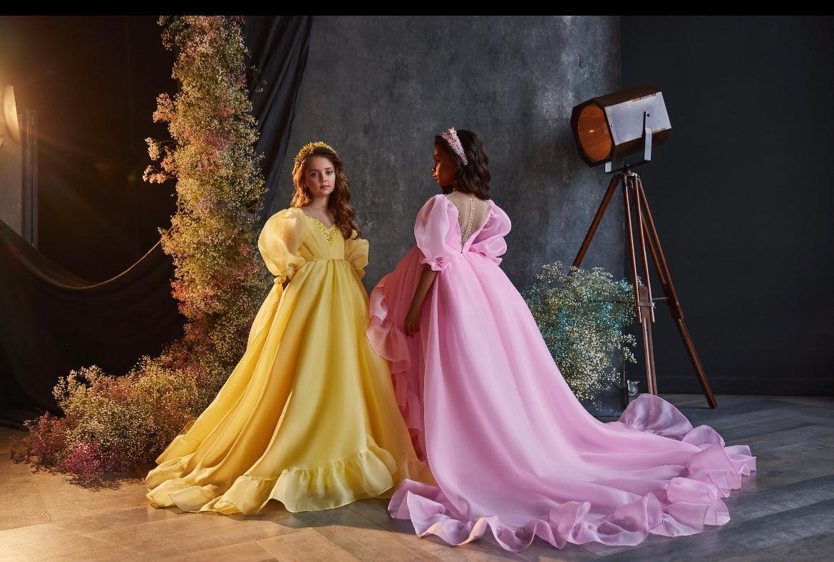 Delightful dress in luscious pink and yellow. This outfit is especially popular with our Princesses! The elegant corset of the dress is symmetrically draped and decorated with faceted stones and crystals. Puffy lantern sleeves add elegance and airiness to the outfit. The skirt of the dress, at the request of the Princess, can be ordered long to the floor or in the "kan-kan" style. The skirt has a beautiful frill along the hem. The back of the dress has a deep M-shaped neckline, decorated with a scattering of stones and crystal buttons. An exquisite outfit with impeccable taste is a gift for a girl who understands beauty and fashion.
