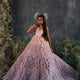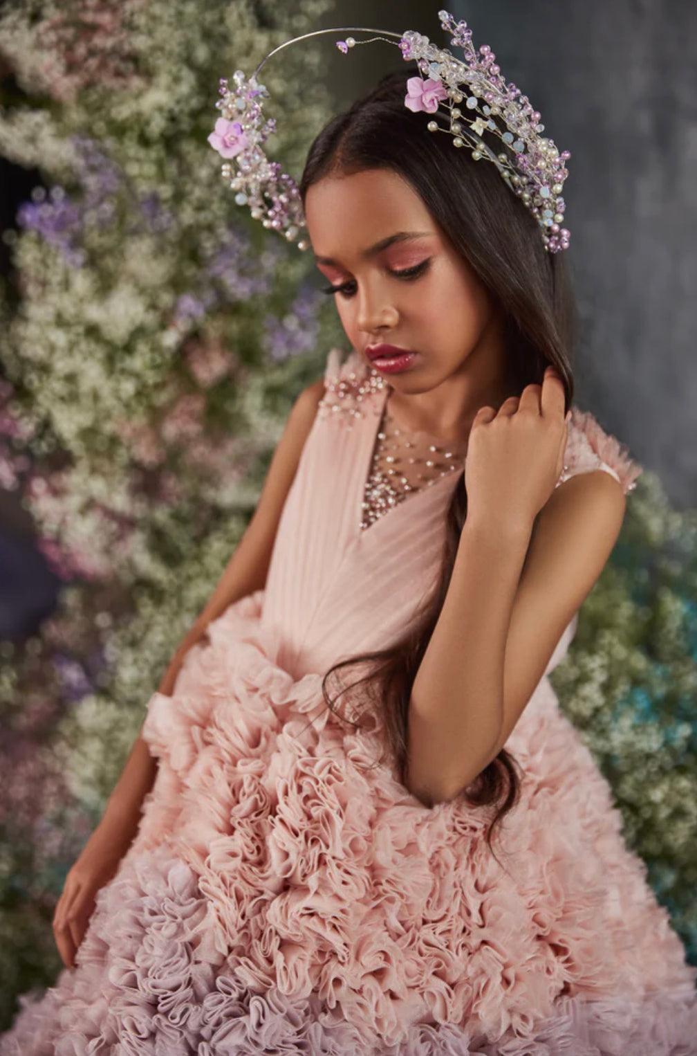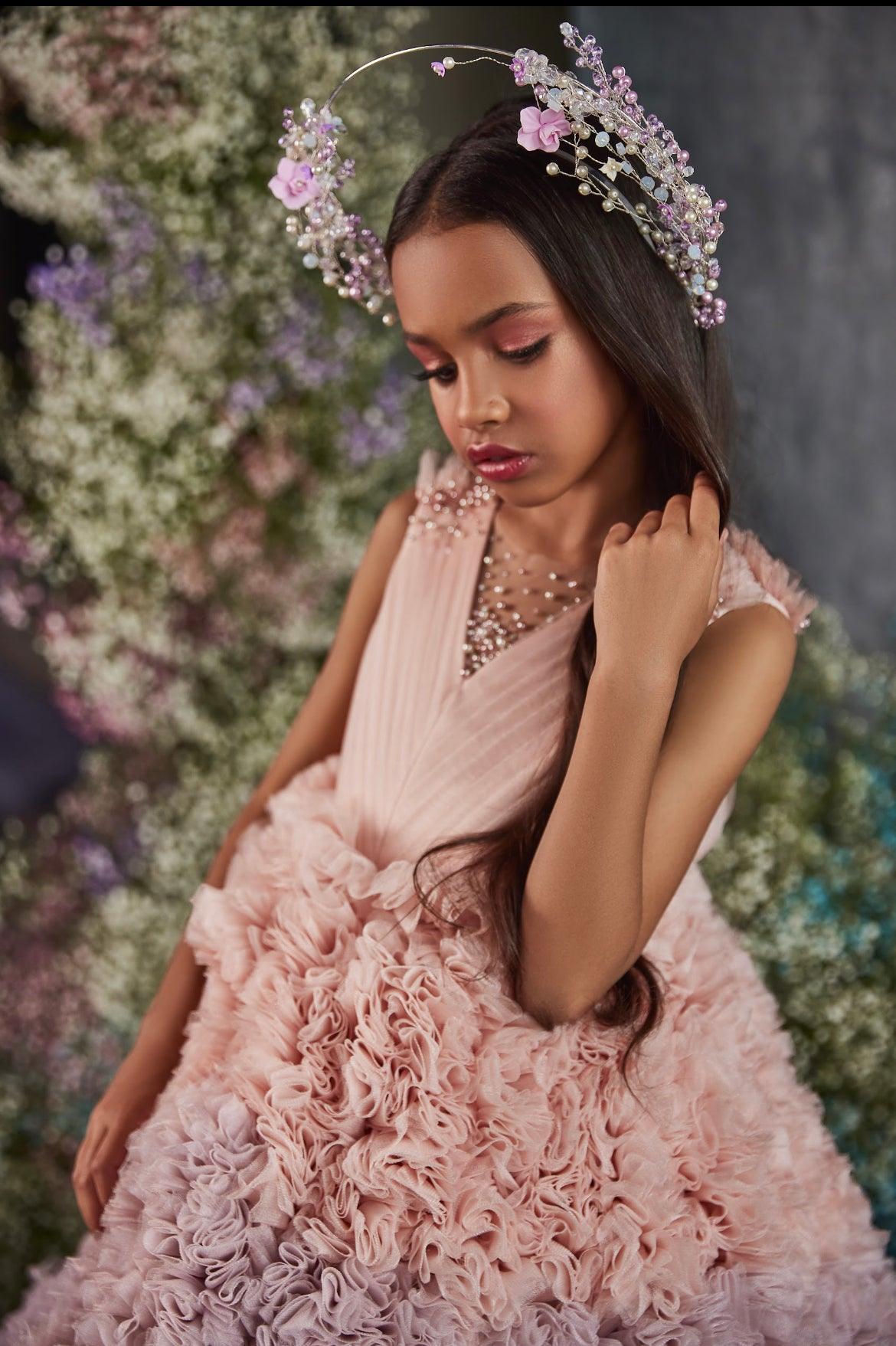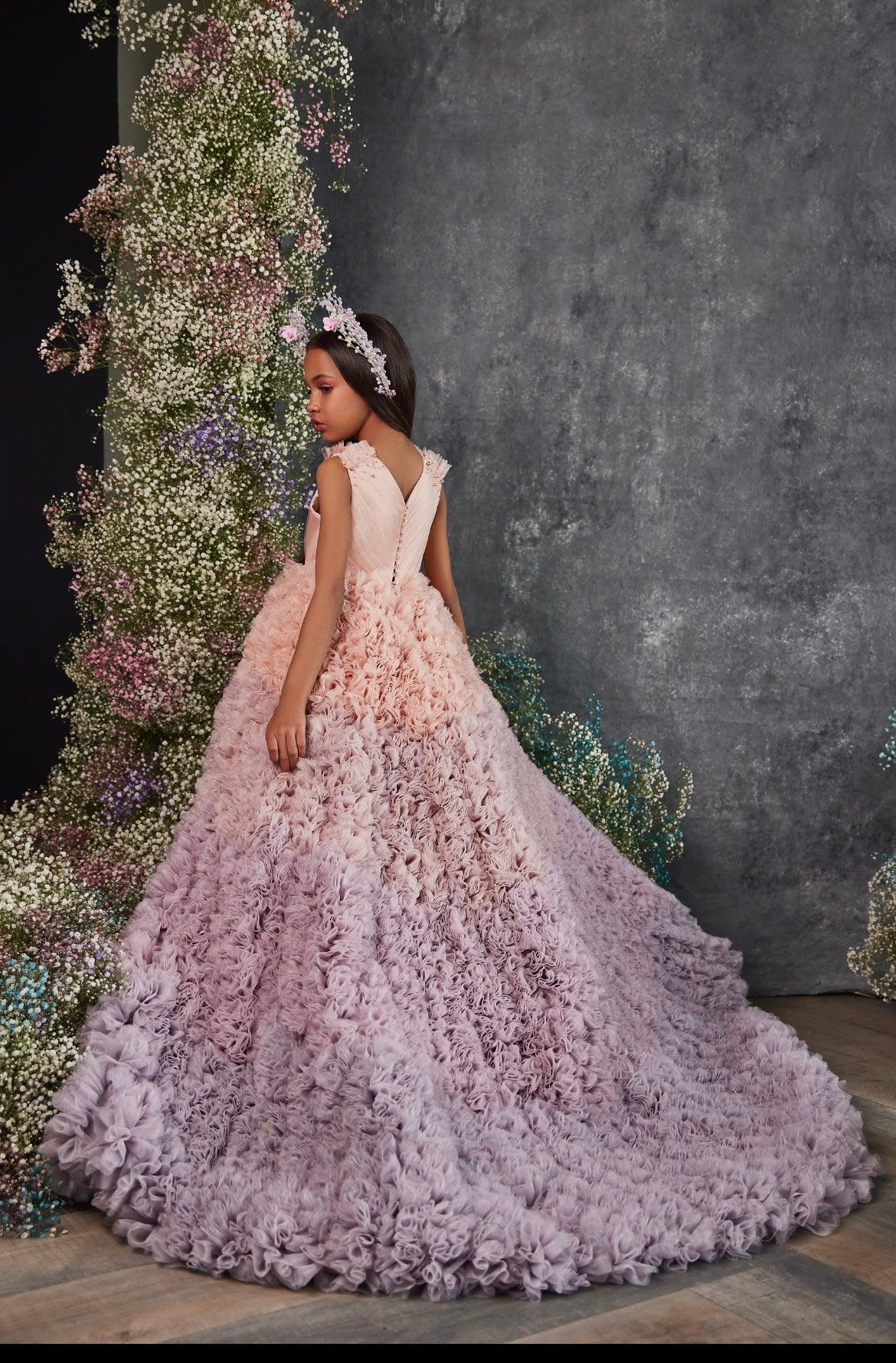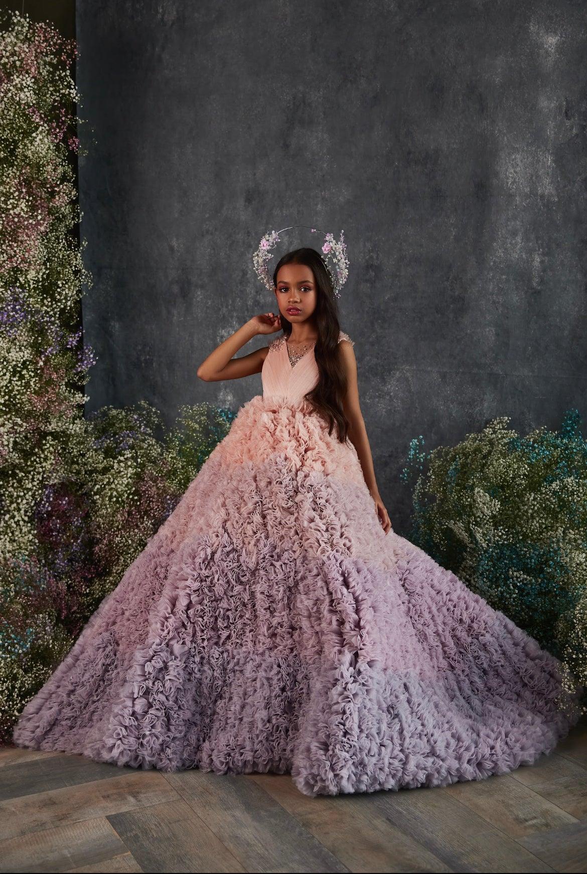 Royal dress with an original gradient on a soft plush skirt! The corset of the dress has an V-shaped neckline embroidered with pearls, symmetrically draped folds turn into gathers on the shoulders decorated with pearls. A fluffy and airy voluminous skirt has a beautiful color transition from pale pink to purple. A small train makes the dress romantic. Amazing outfit for the holiday, in which the girl will be a real princess.