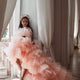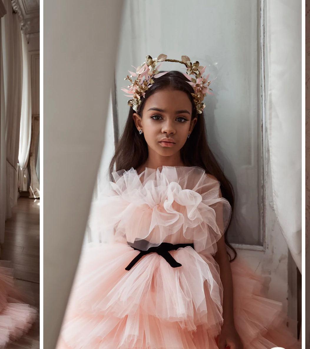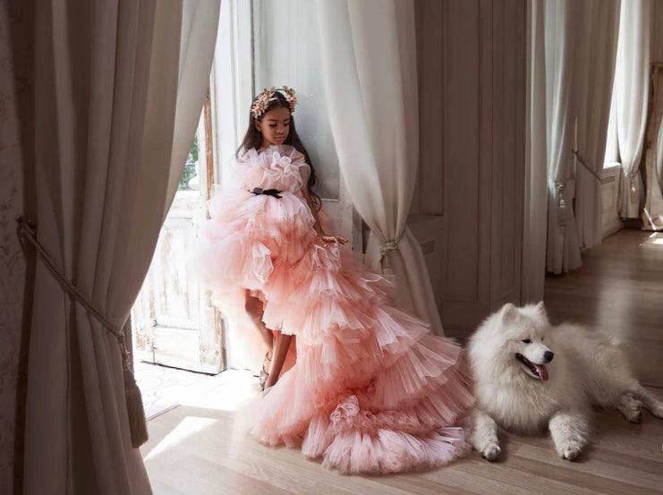 Girls ruffled high low dress is One-of-a-kind ruffled high-low dress made of yards of bridal best quality tulle. From a voluminous bodice to a gradual cascade of ruffles, this unique gown will surely become one of your favorites! Available in colors: blush, champagne, pink, coral, purple, fuchsia, light blue, turquoise, teal, including white and ivory. Contrasting black velvet waistband stays black with any color option.