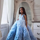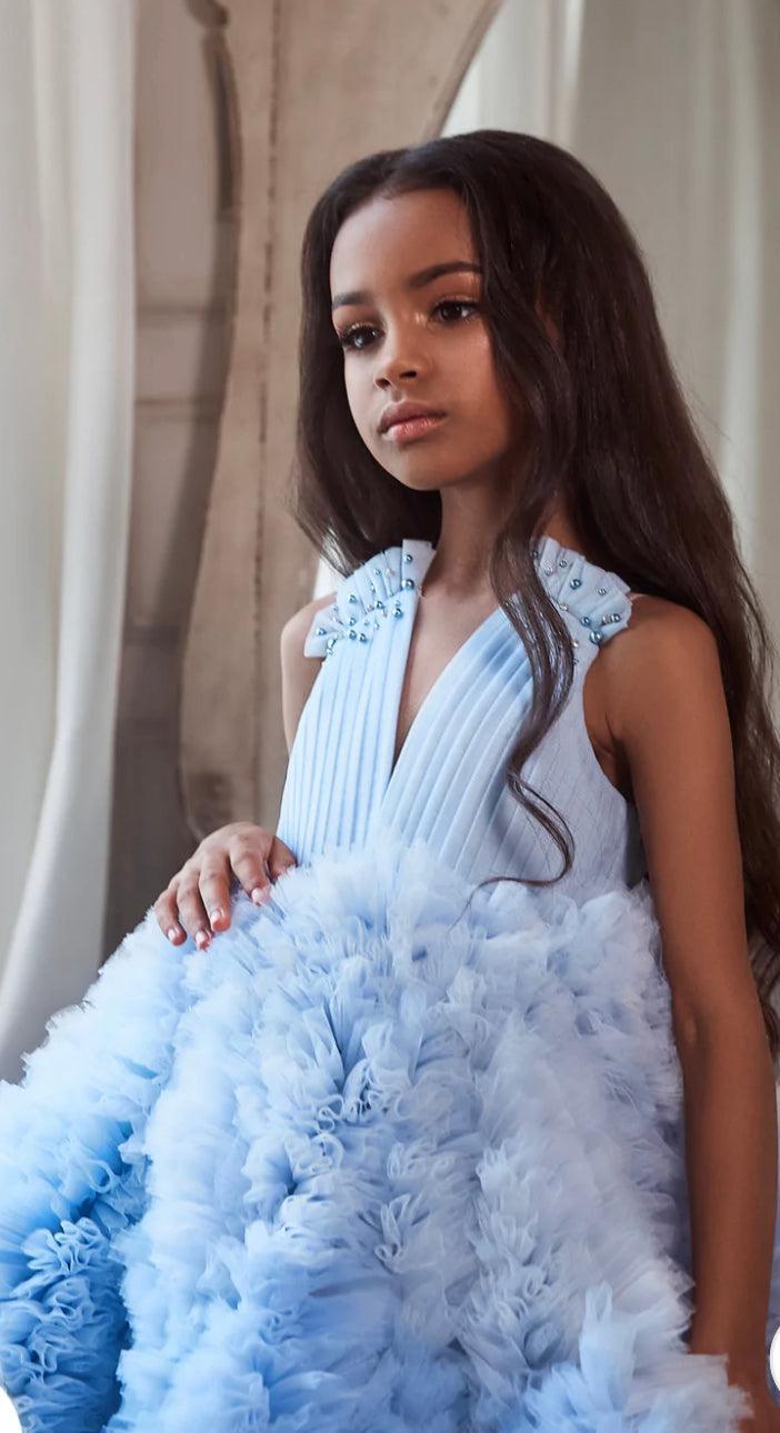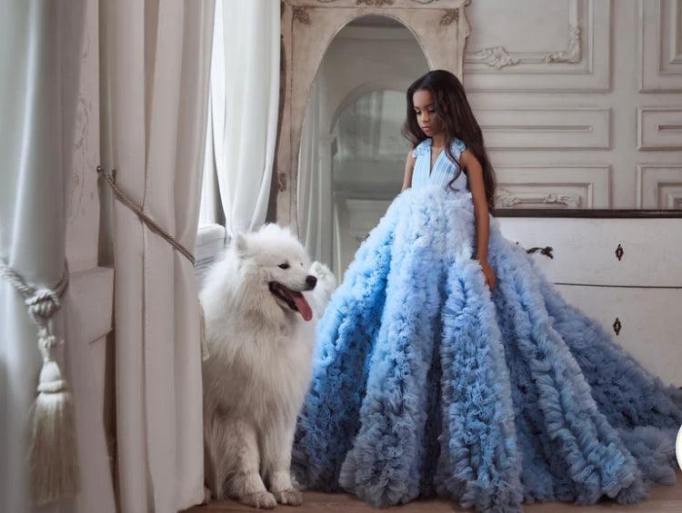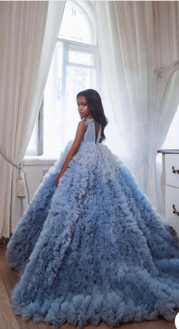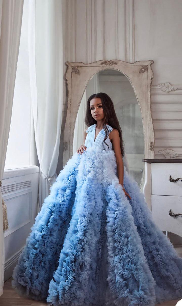 A vertiginous blue beautiful dress with fluffy ruffles looks very feminine. The one-of-the-kind gown features a maxi-ruffled Ombre skirt and a pleated top with a V-cut neckline. Scattered beads on both sides of the shoulders add a sparkly touch to this fabulous princess dress.